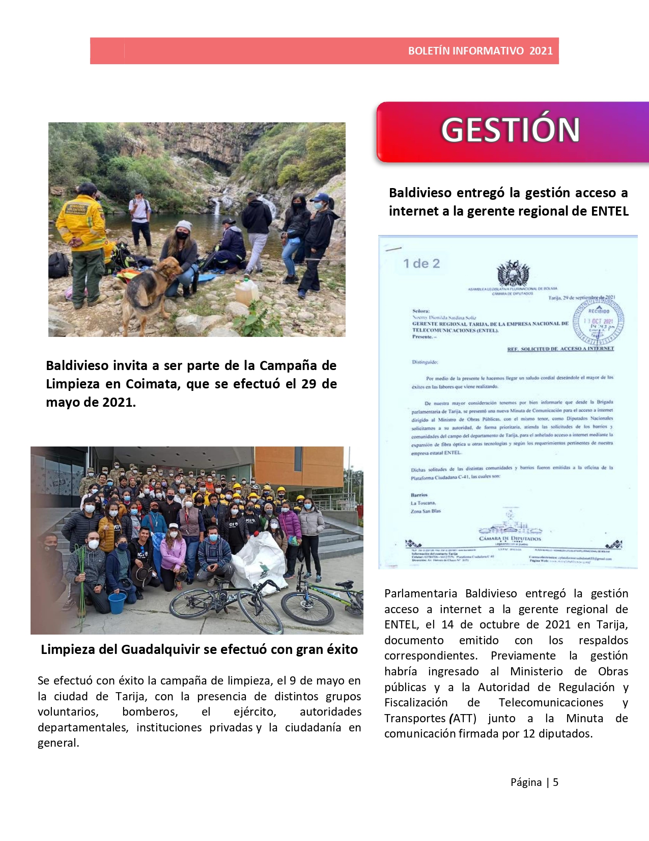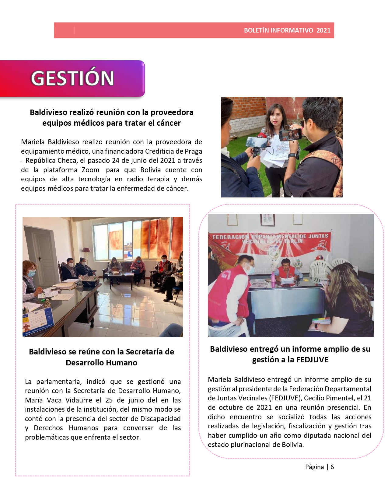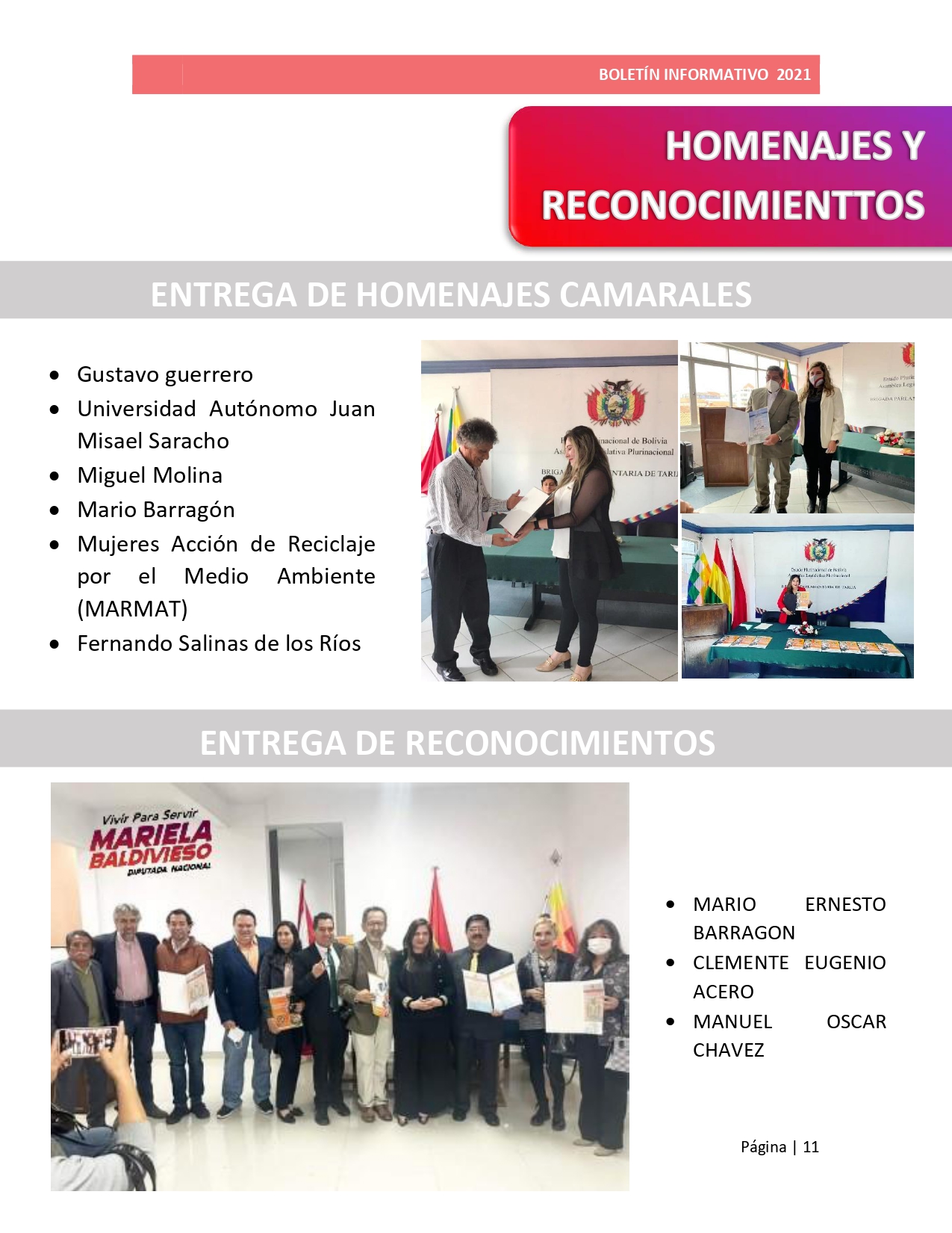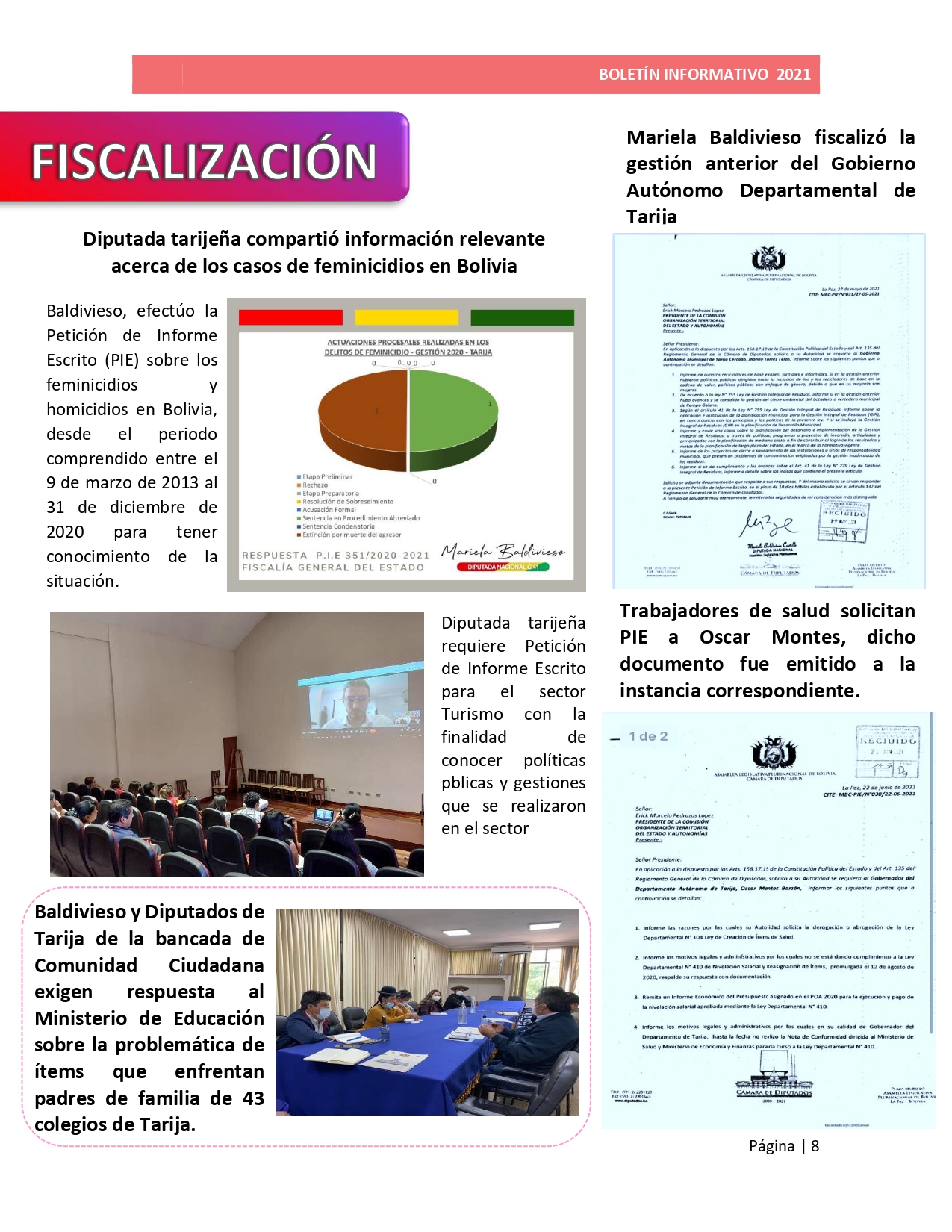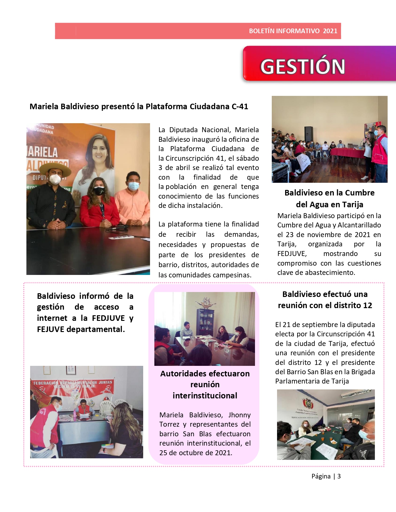 La Diputada Mariela Baldivieso ha continuado desempeñando un papel fundamental en la promoción del desarrollo y la mejora de la calidad de vida en el Departamento de Tarija durante su gestión en el año 2021. A lo largo de la gestión, ha liderado una serie de iniciativas significativas que merecen un reconocimiento especial.