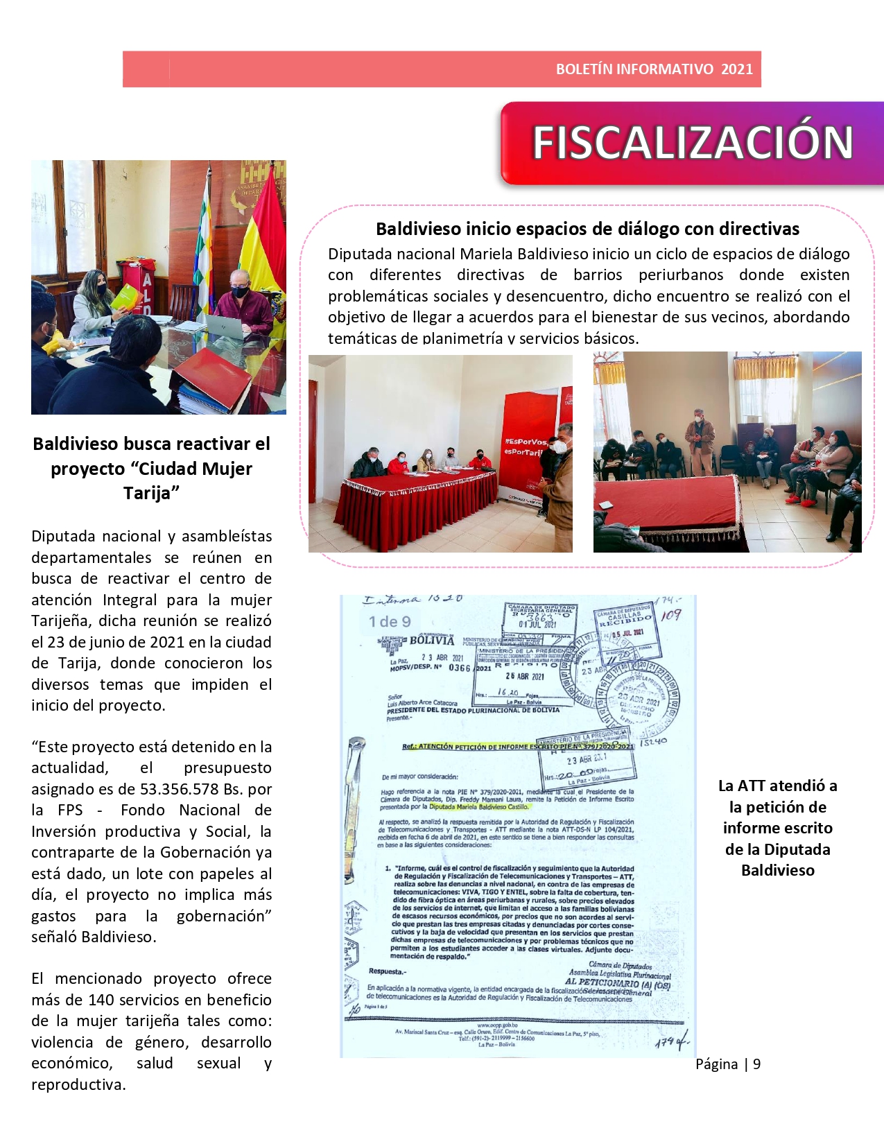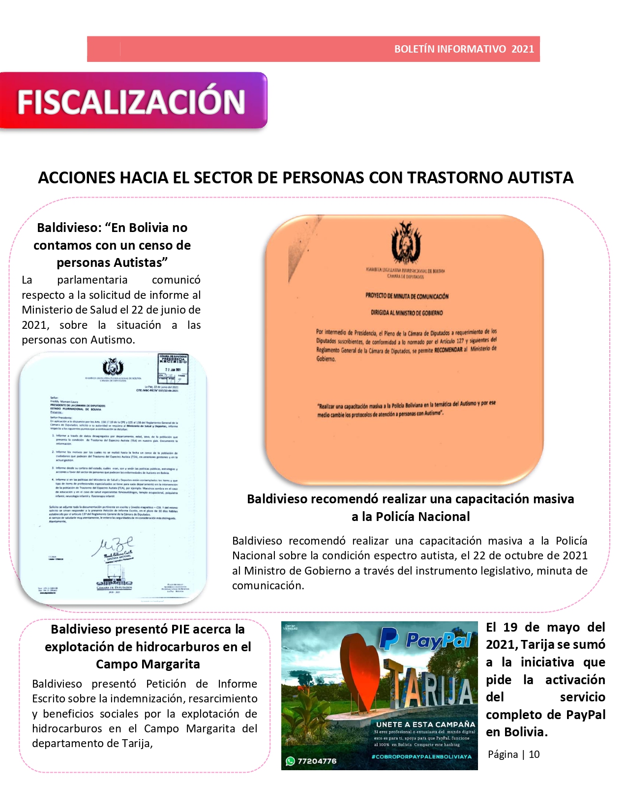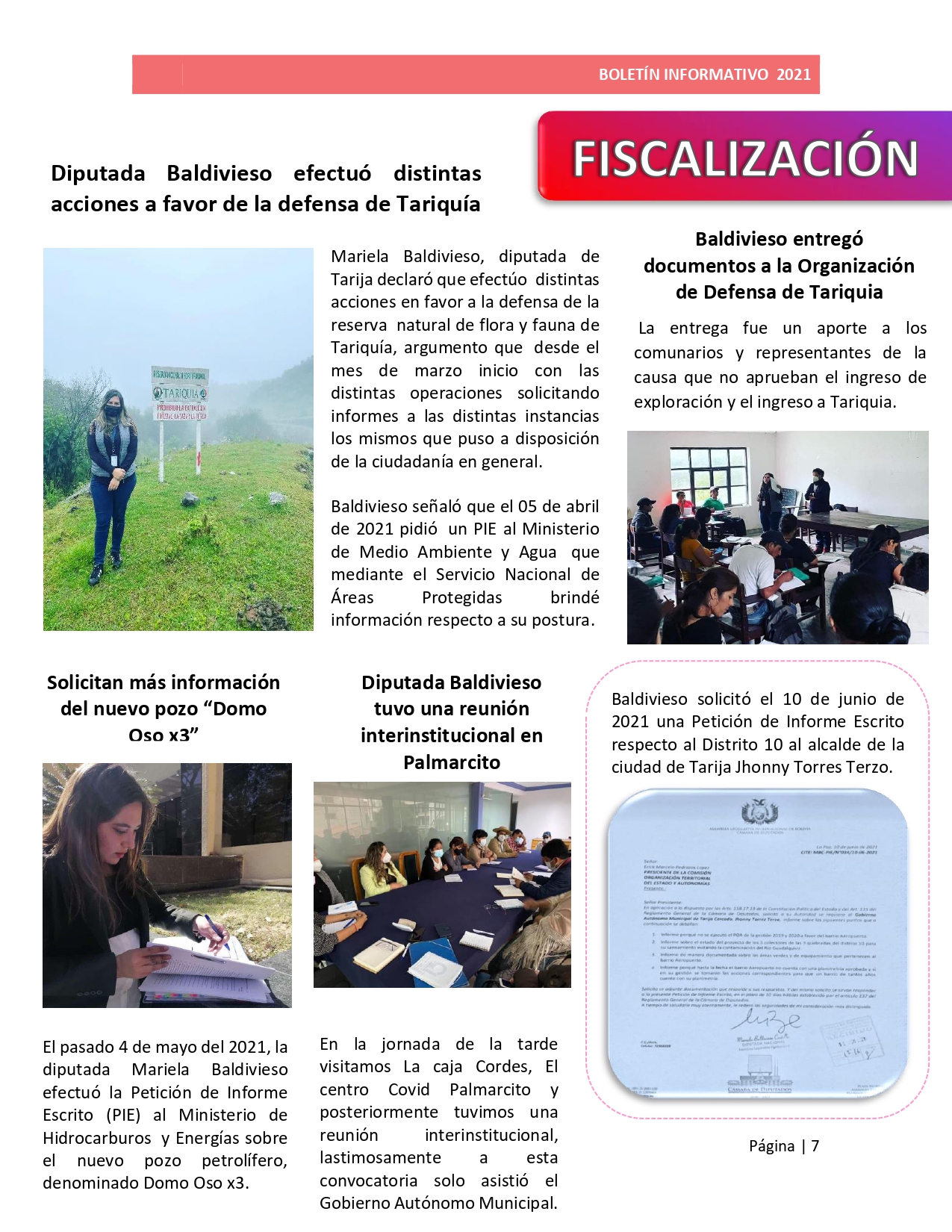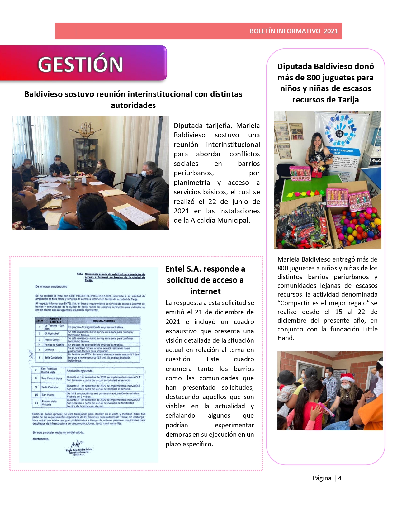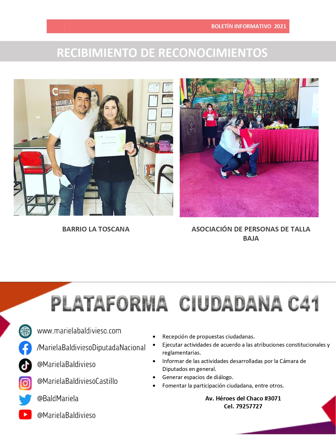 La Diputada Mariela Baldivieso ha continuado desempeñando un papel fundamental en la promoción del desarrollo y la mejora de la calidad de vida en el Departamento de Tarija durante su gestión en el año 2021. A lo largo de la gestión, ha liderado una serie de iniciativas significativas que merecen un reconocimiento especial.