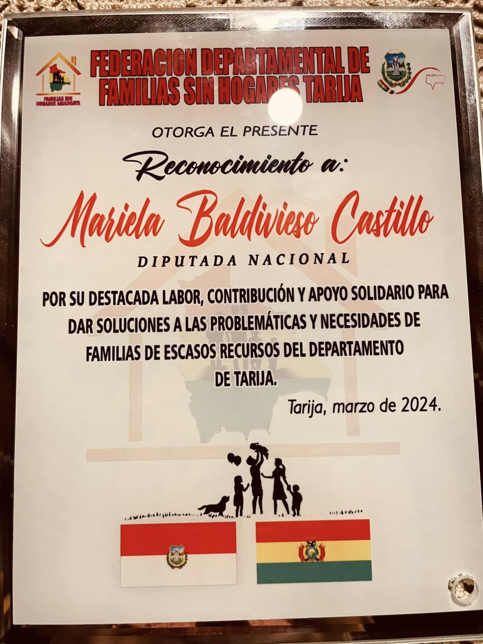 Emotivo Reconocimiento a la diputada Baldivieso por su Apoyo a las Familias sin Hogar de Tarija