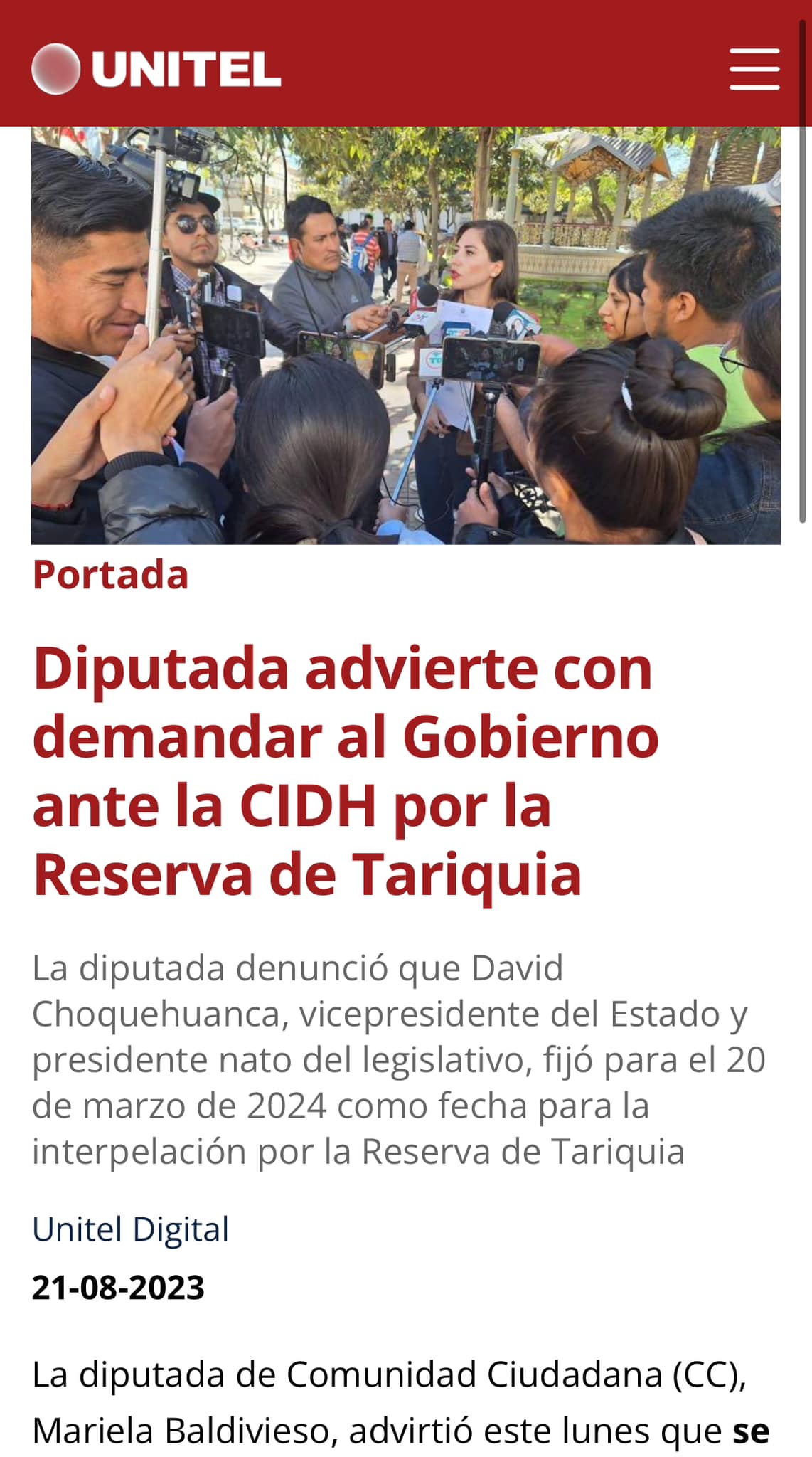 El 19 de mayo de 2024, ante la negativa de una interpelación, la diputada nacional Mariela Baldivieso anuncia la presentación de una petición de informe oral contra los Ministros de Hidrocarburos y Medio Ambiente, como parte de su compromiso con la transparencia y rendición de cuentas en el servicio público. Además, Baldivieso aguarda la resolución del Tribunal Constitucional Plurinacional sobre acciones populares presentadas, mientras continúa defendiendo los derechos de la comunidad tarijeña en instancias nacionales e internacionales.