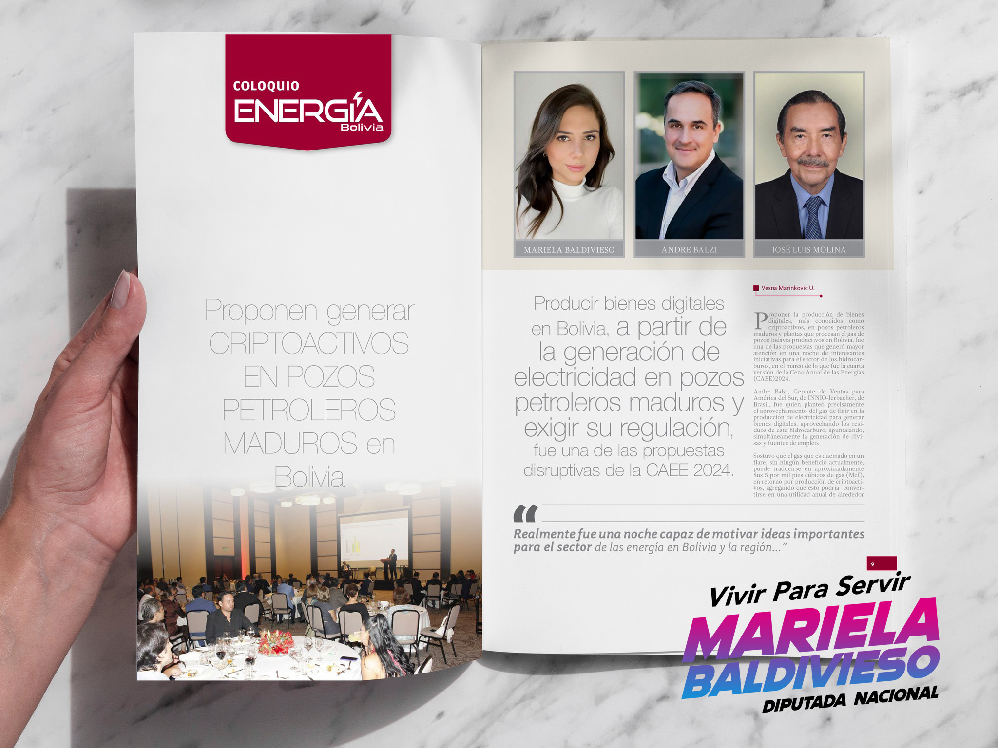 23 de mayo de 2024.- La diputada Mariela Baldivieso, protagonizo la portada de la revista Energía Bolivia de Santa Cruz en la edición 130; donde también compartió su opinión en la nota denominación: Proponen generar Criptoactivos en pozos Petroleros maduros en Bolivia.