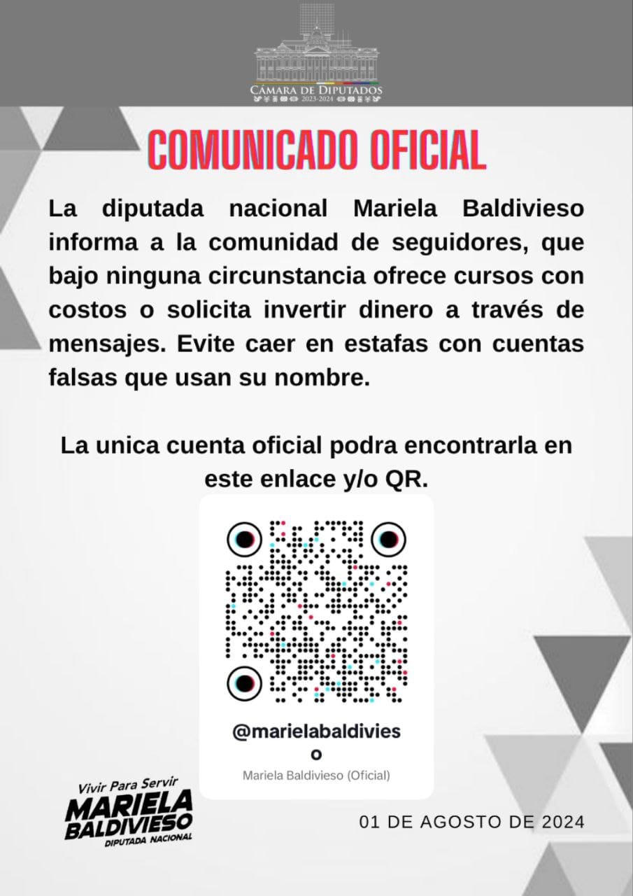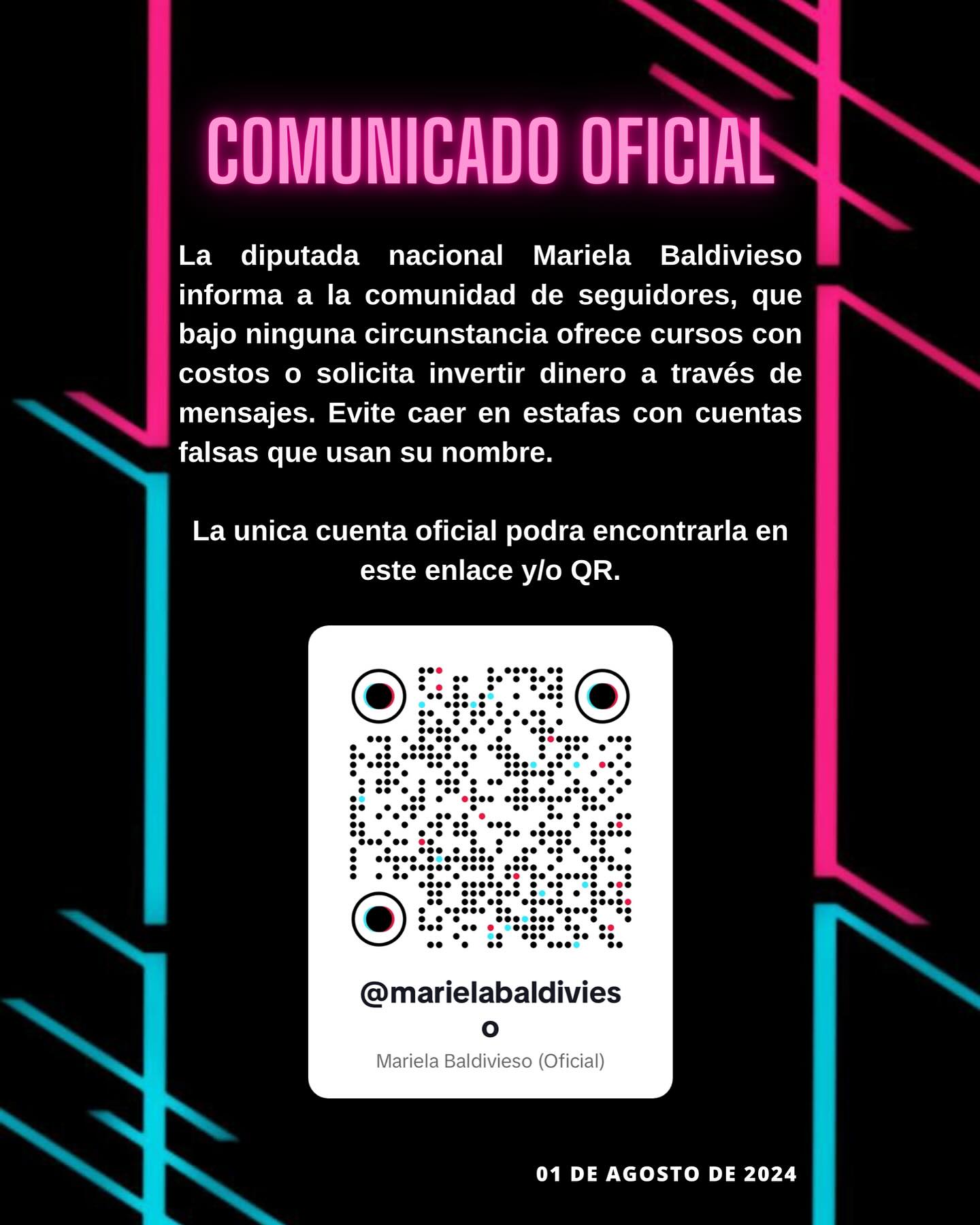 El pasado 01 de agosto de 2024, la diputada nacional Mariela Baldivieso a través de sus cuentas oficiales de redes sociales, lanzo un comunicado dirigido a sus más de cuarenta mil seguidores. En el mismo advertía a la ciudadanía a no caer en ciberestafas con cuentas falsas que usan su nombre e incitan a las personas a invertir dinero y dar información privada.