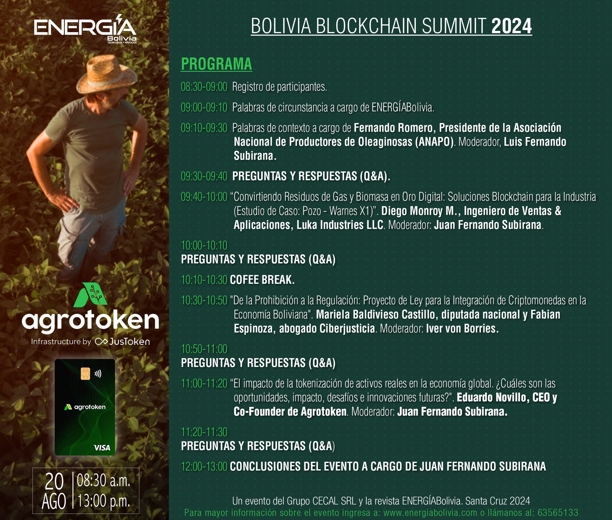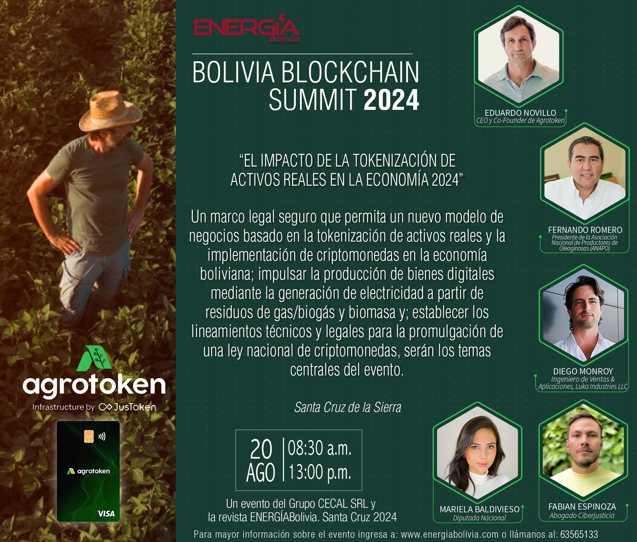 El 20 de agosto de 2024 en Santa Cruz de la Sierra, fue sede del Bolivia Blockchain Summit 2024, un evento organizado por la revista Energía Bolivia y el grupo CECAL SRL. Bajo el tema "El impacto de la tokenización de activos reales en la economía 2024", se abordaron los desafíos y oportunidades que la economía boliviana podría enfrentar con la adopción de criptomonedas y la tokenización de activos.