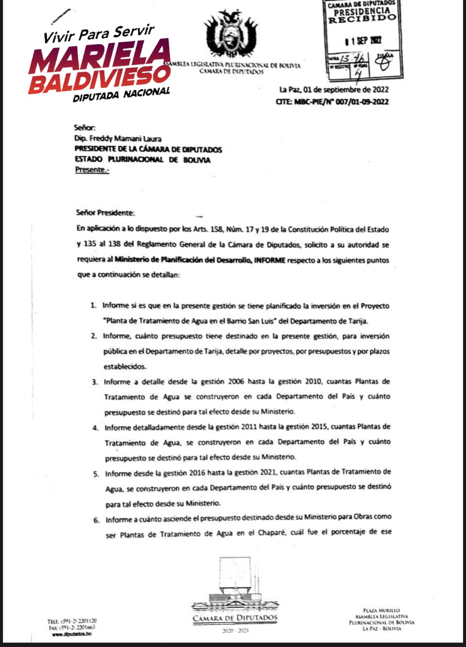 Mariela Baldivieso fiscaliza el proyecto Planta de Tratamiento de Agua en el Barrio San Luis” del departamento de Tarija, el 5 de septiembre del 2022 en la ciudad de La Paz, mediante el instrumento de fiscalización denominado, petición de informe escrito.