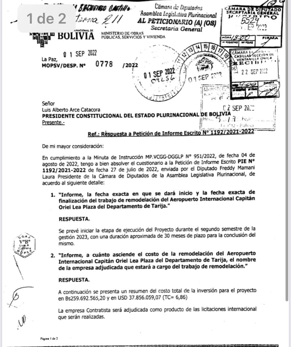 Diputada de la bancada de Comunidad Ciudadana, Mariela Baldivieso informó que Tarija tendrá que esperar hasta el segundo semestre del 2023 para la remodelación del Aeropuerto Cap. Oriel Lea Plaza y su la pista de aterrizaje. Dicha información fue emitida el 3 de...