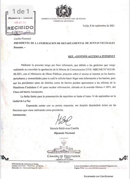 Mariela Baldivieso, diputada tarijeña informó de la gestión de acceso a internet a la Federación Departamental de Juntas Vecinales (FEDJUVE) y a la Federación de Juntas Vecinales (FEJUVE), el 8 de septiembre de 2021 a través...