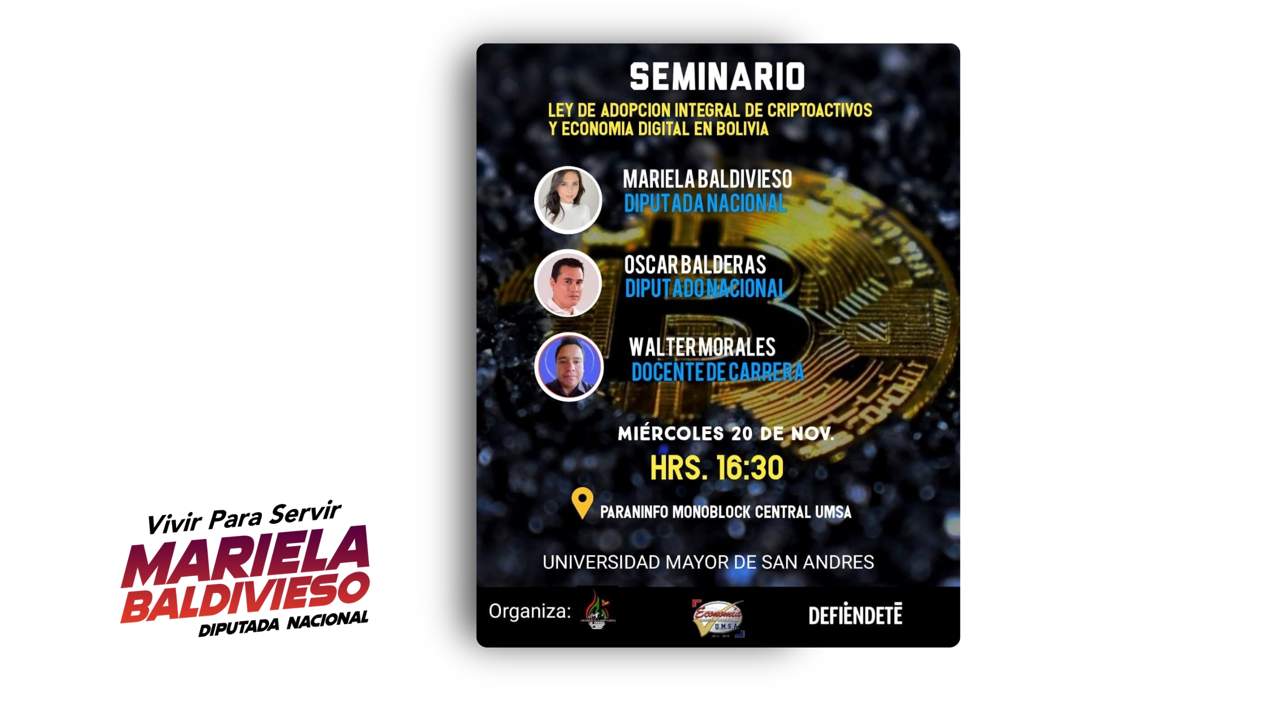 El pasado viernes 23 de agosto de 2024, la diputada nacional Mariela Baldivieso Castillo encabezó el foro "Proyecto de Ley de Adopción Integral de Criptoactivos" en la Brigada Parlamentaria de Tarija. El evento, que contó con la participación de destacados exper...
