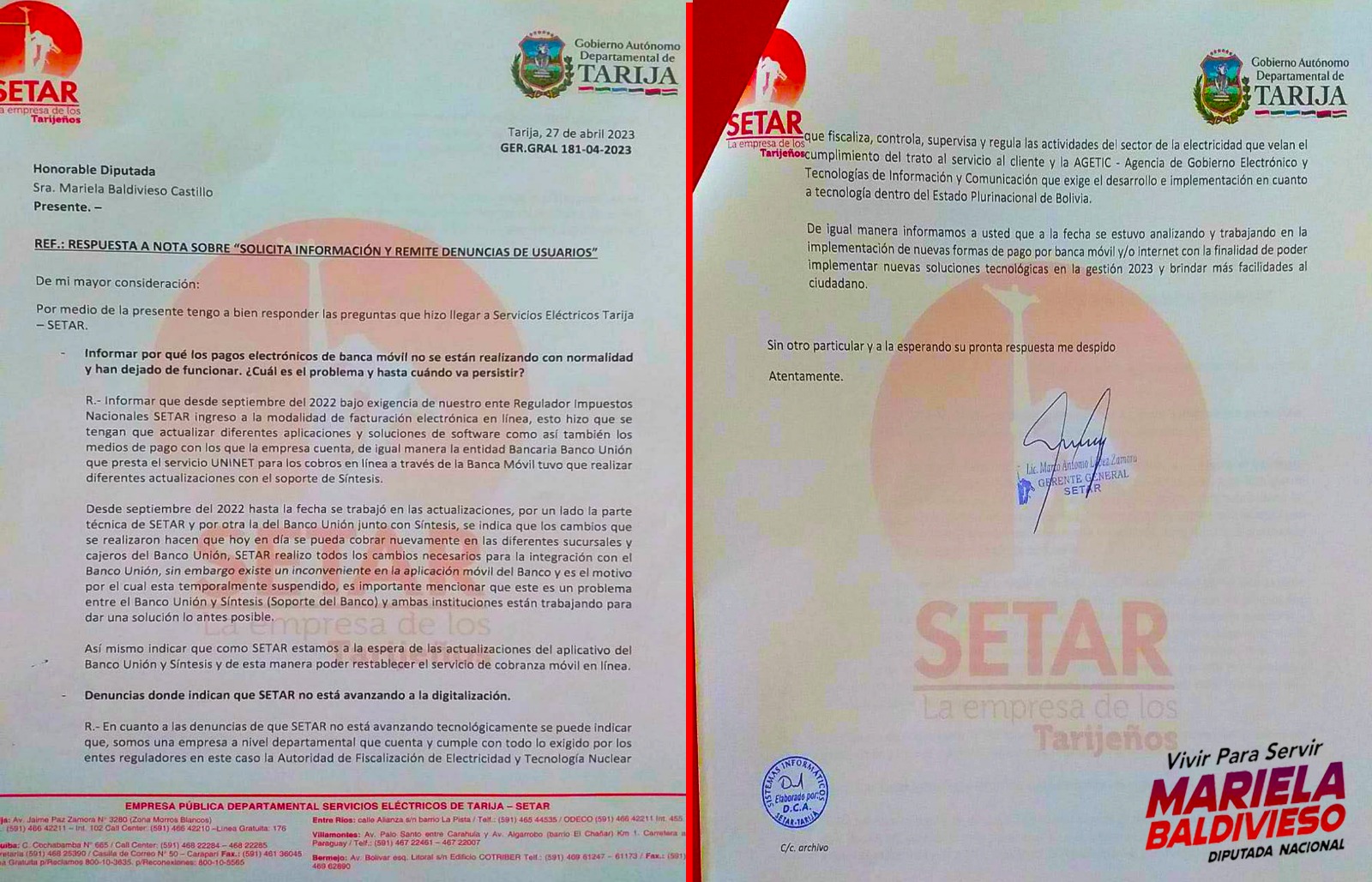 En base a la solicitud de información remitida por la Diputada Mariela Baldivieso a la Empresa Setar, el martes 02 de mayo, la empresa de Electricidad respondió a la petición sobre las denuncias del pueblo tarijeño.