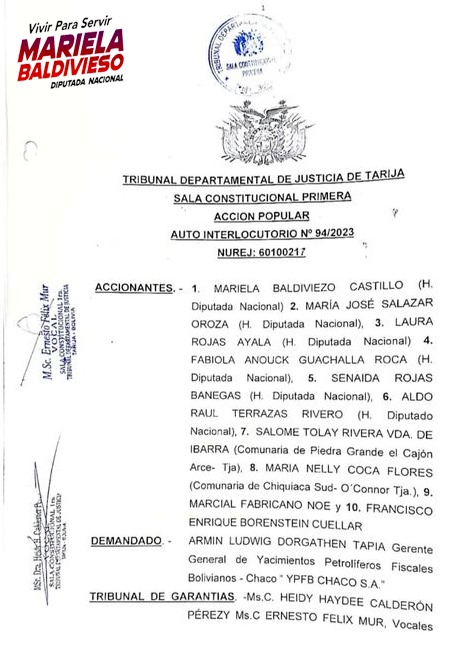 El 10 de mayo el Tribunal Departamental de Justicia de Tarija respondió a la apelación de la segunda acción popular que se ingresó en Santa Cruz, dictando una audiencia de forma virtual el miércoles 17 de mayo de 2023 a las 10:00 horas.