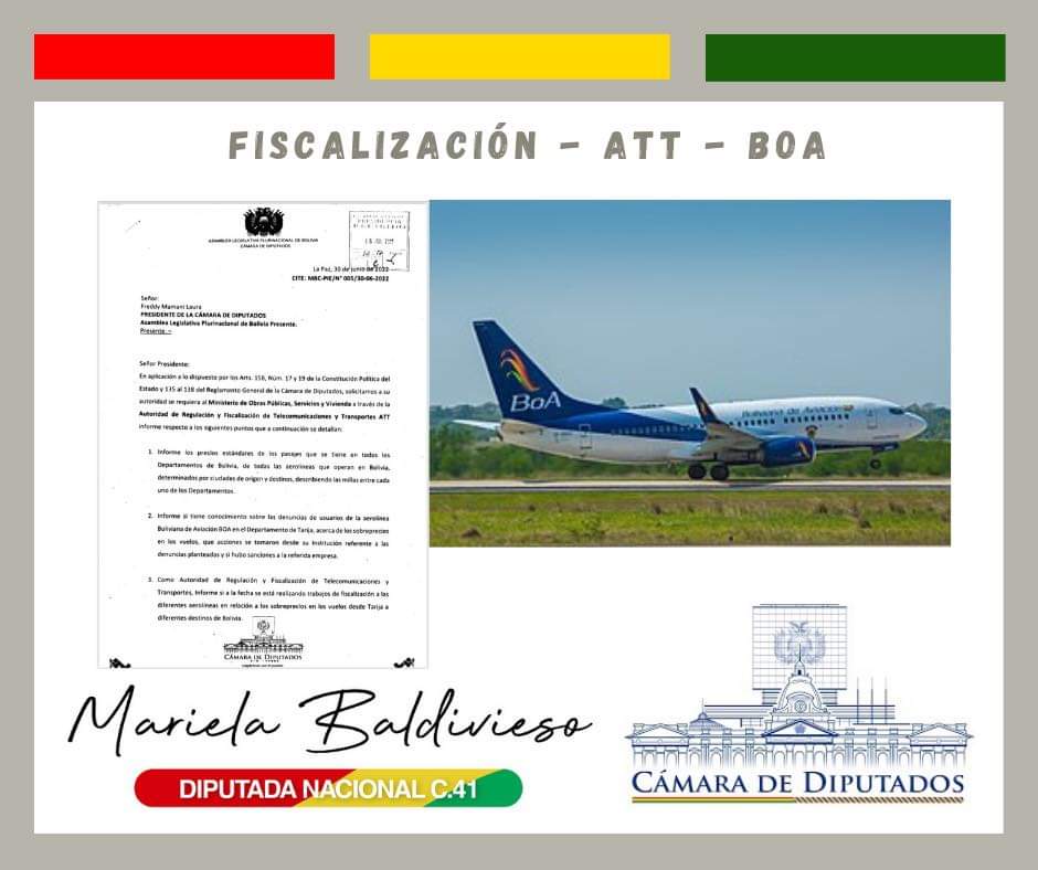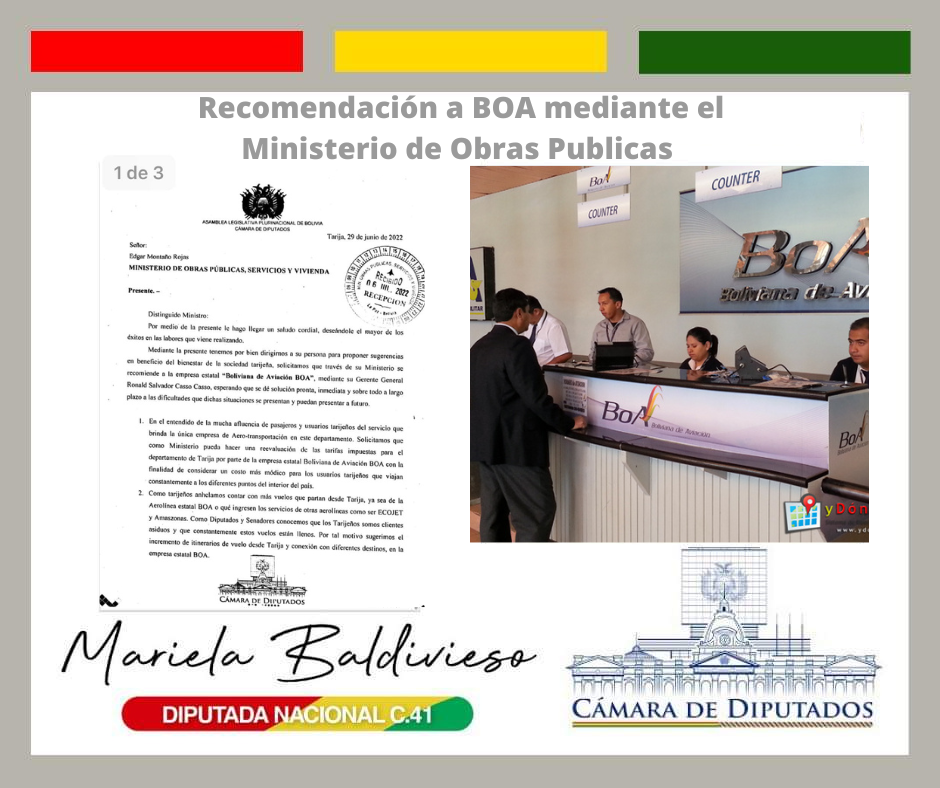 El pasado 7 de julio de 2022, los Senadores y Diputados de la Bancada de Comunidad Ciudadana de Tarija enviaron recomendaciones a la empresa estatal Boliviana de Aviación, mediante una nota formal escrita al Ministerio de Obras Publicas.