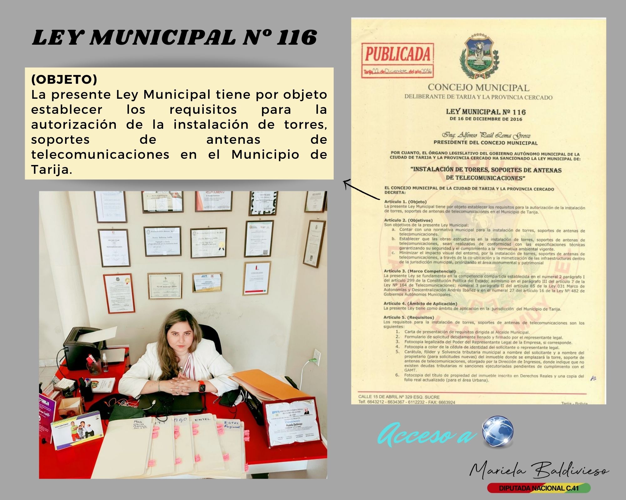 Mariela Baldivieso informó que la Ley Municipal N° 116 del 2019 es un impedimento para el acceso a internet en los barrios periurbanos y comunidades de Tarija, el 07 de febrero de 2022 en una entrevista realizada por la página digital Sin Anestesia.