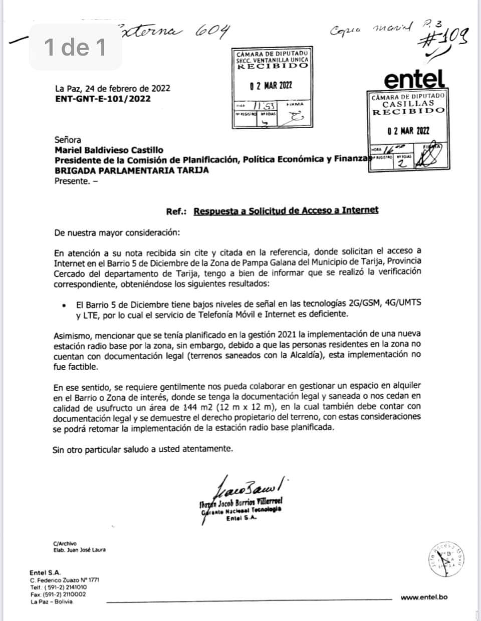 La Empresa Nacional de Telecomunicaciones Entel S.A. responde a la nota referente a la ampliación de fibra óptica y servicio de acceso a internet en los barrios periurbanos y comunidades de la ciudad de Tarija. Dicha nota fue respondida el 21 de diciembre de 2021, en el cual emite un c...