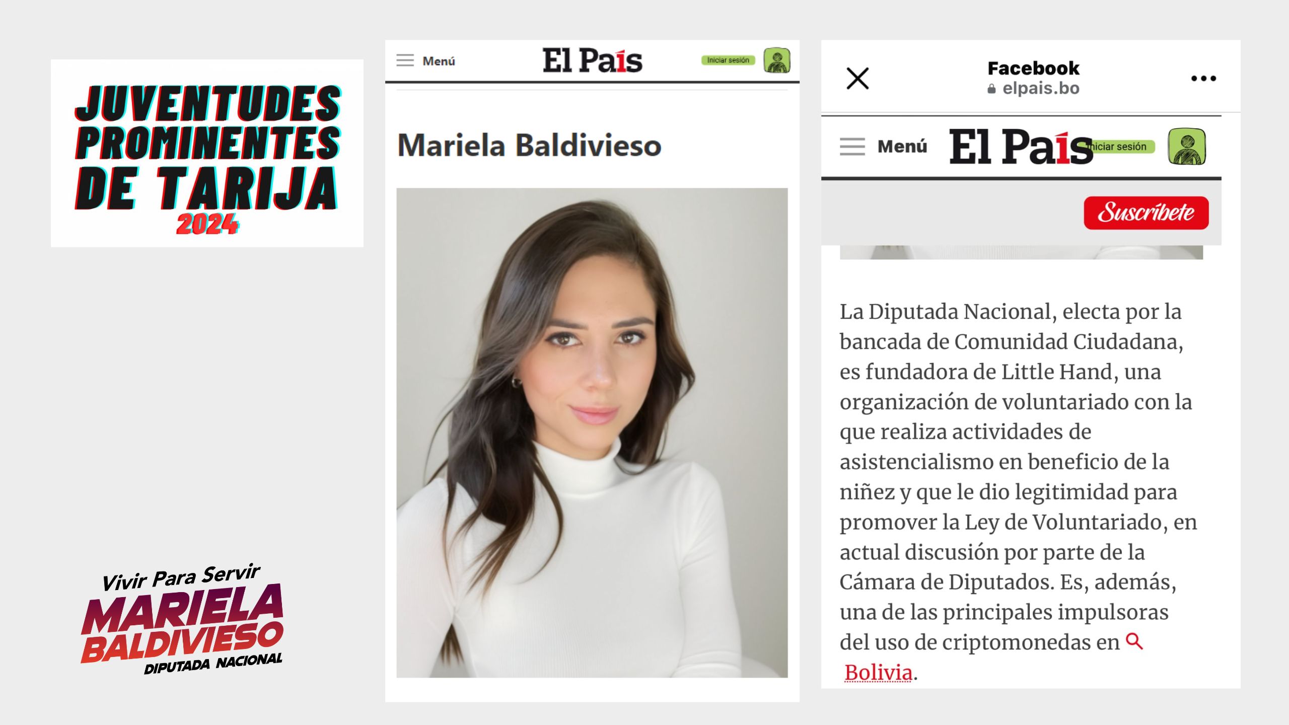 El 12 de agosto de 2024, fecha en la que se celebra el Día Internacional de la Juventud, se reveló la lista de los 36 jóvenes prominentes seleccionados de este año del departamento de Tarija, en el periódico EL PAÍS. La diputada nacional Mariela Baldivieso C...