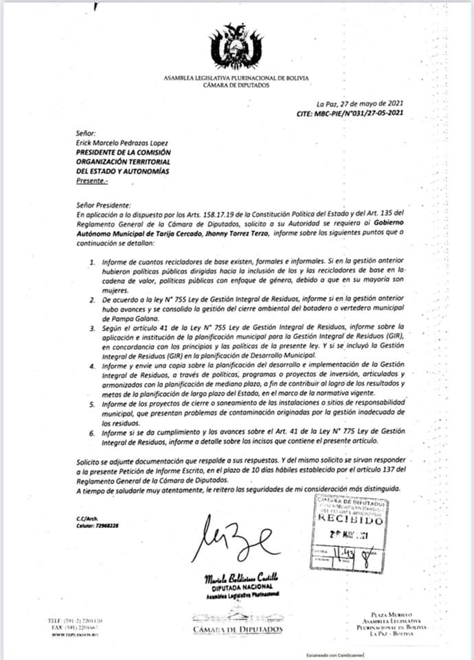 La legisladora, Mariela Baldivieso fiscaliza la gestión anterior del Gobierno Autónomo Departamental de Tarija y al Gobierno Autónomo Municipal de Cercado, sobre la aplicación de la Ley 755 de Gestión Integral de Residuos Sólidos, el cual se solicitó...