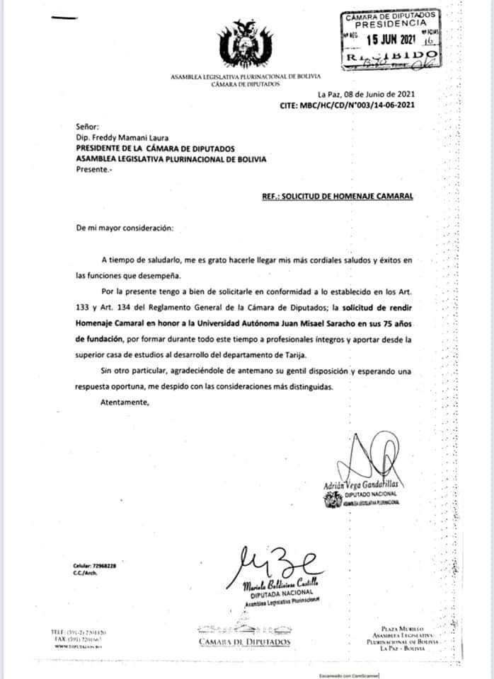 Los legisladores Mariela Baldivieso y Adrián Vega ingresan el Proyecto de Homenaje Camaral a favor de la Universidad Autónoma Juan Misael Saracho por sus 75 años de fundación, el 15 de junio de 2021 en la ciudad de La Paz, dicho documento fue present...