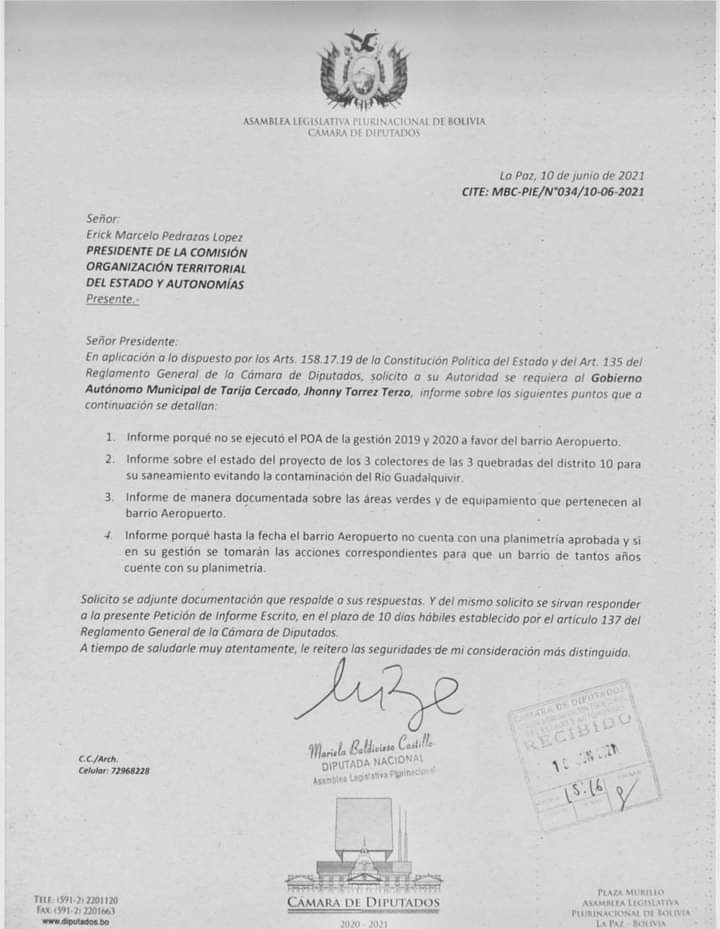 El 10 de junio del 2021 la legisladora Mariela Baldivieso solicitó Petición de Informe Escrito (PIE) al alcalde de la ciudad de Tarija, Jhonny Torres Terzo, mediante una nota formal el cual fue a pedido de los ciudadanos del barrio Aeropuerto del Distrito 10.