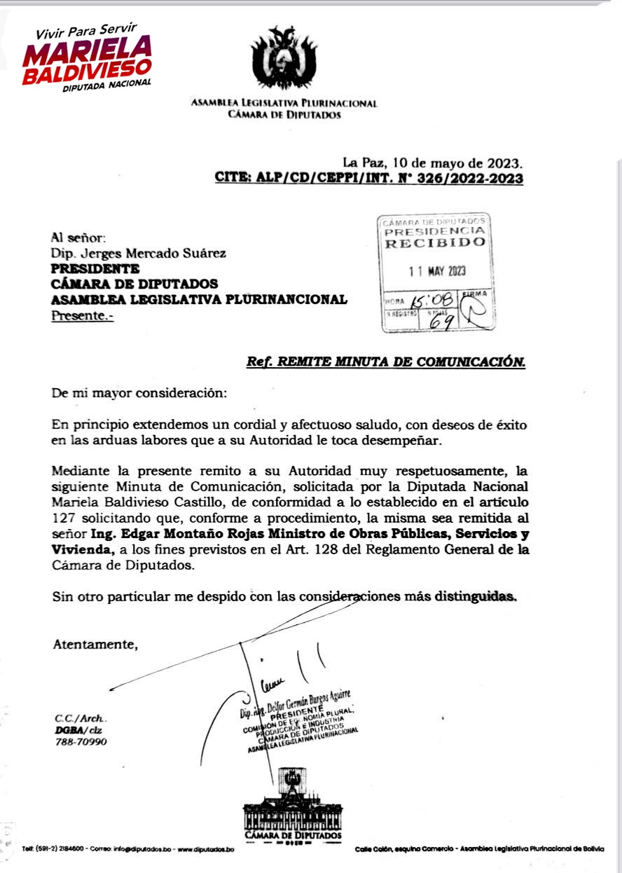 Bajo la normativa de la Cámara de Diputados, el 16 de mayo del presente año, la Comisión de Economía Plural, Producción e Industria, aprobó la Minuta de Comunicación donde se recomienda al Ministro de Obras Publicas que no se subro...