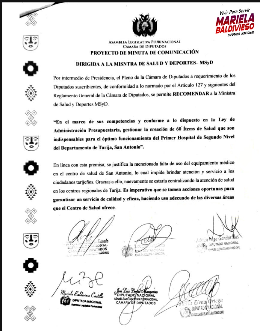 El 10 de julio de la presente gestión, la Diputada por el departamento de Tarija, Mariela Baldivieso, pidió 60 Ítems para el Hospital de Segundo Nivel San Antonio.