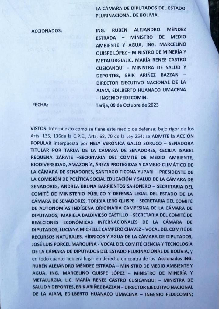 En un decidido esfuerzo por preservar el río Pilcomayo, la Diputada Mariela Baldivieso, junto a la Senadora Nely Gallo y destacados asambleístas de Comunidad Ciudadana, han firmado la Acción Popular como respuesta a la amenaza de la Minería Devastadora. Este compromiso, admitido por la Sala Constitucional Segunda del Tribunal Departamental de Justicia de Tarija el 9 de octubre de 2023, marca un hito significativo en la defensa del ecosistema.