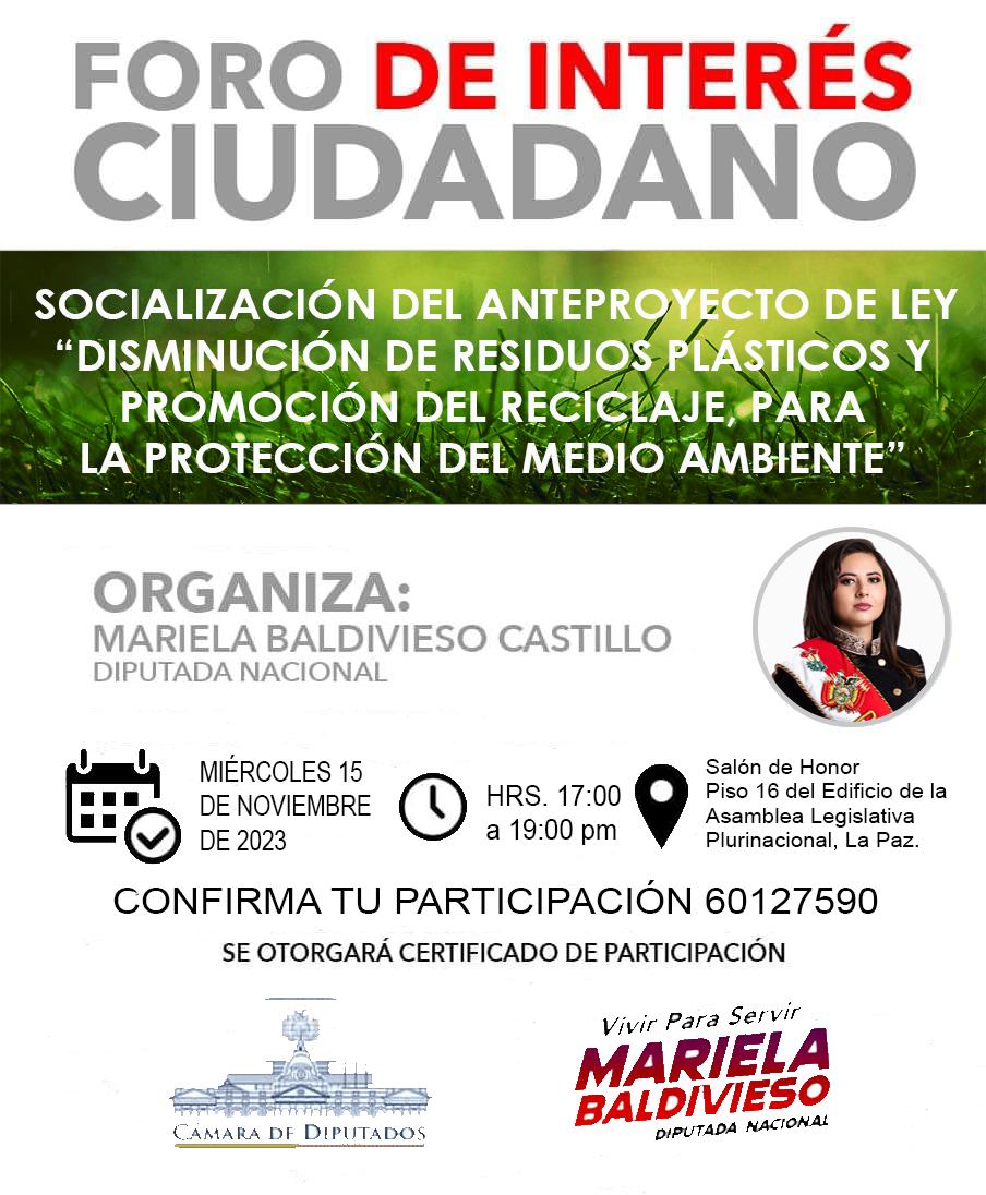 El 15 de noviembre de 2023, la Diputada Mariela Baldivieso lideró la presentación del anteproyecto de ley "Disminución de Residuos Plásticos y Promoción del Reciclaje para la Protección del Medio Ambiente" en la Asamblea Legislativa Plurinacional de Bolivia. El evento, desarrollado en el piso 16 del edificio legislativo, brindó la oportunidad de compartir detalles sobre la propuesta y abrir un espacio de diálogo entre representantes legislativos y la ciudadanía. La jornada concluyó con un ambiente positivo y la esperanza de avanzar hacia medidas concretas para abordar la problemática de los residuos plásticos en el país.