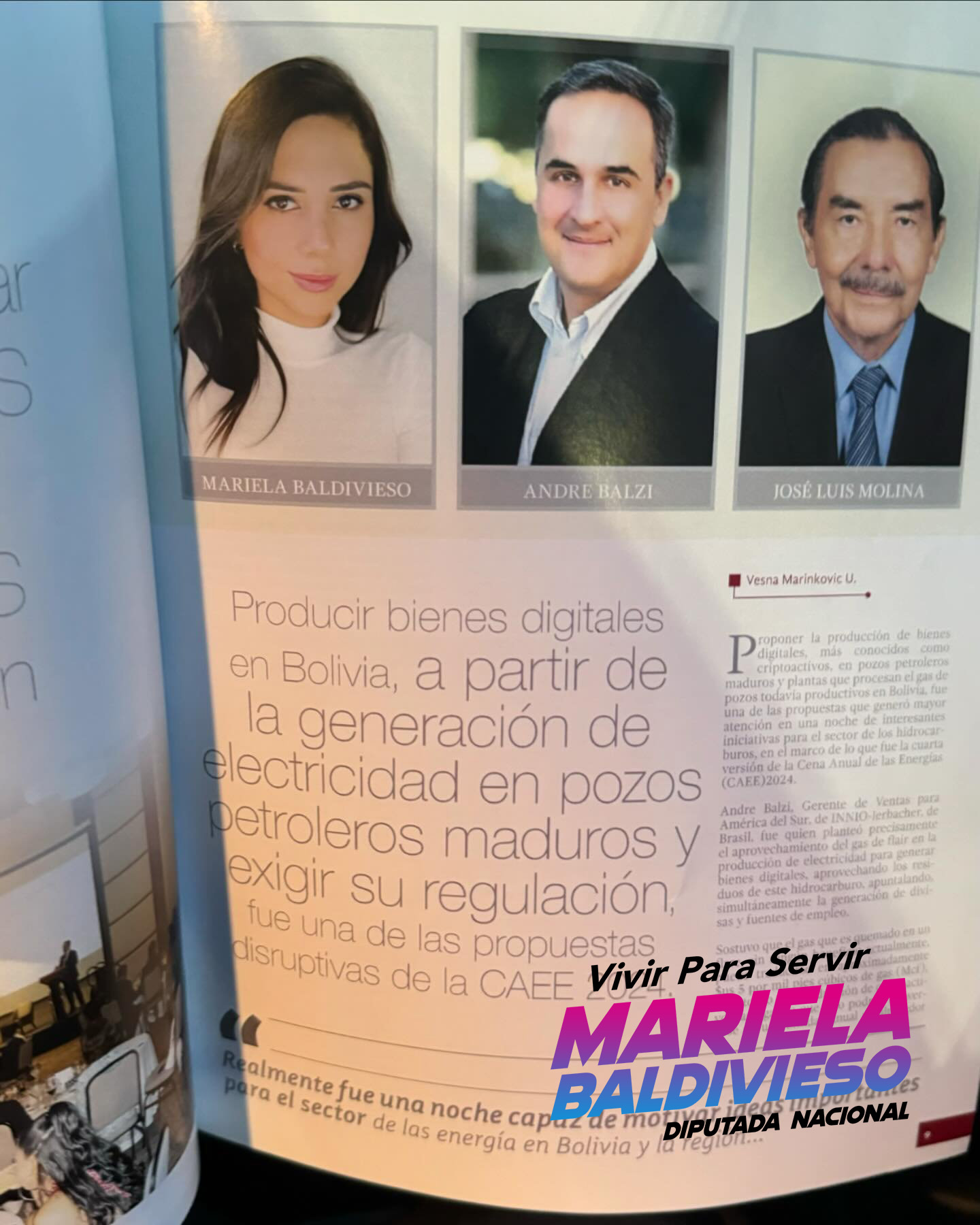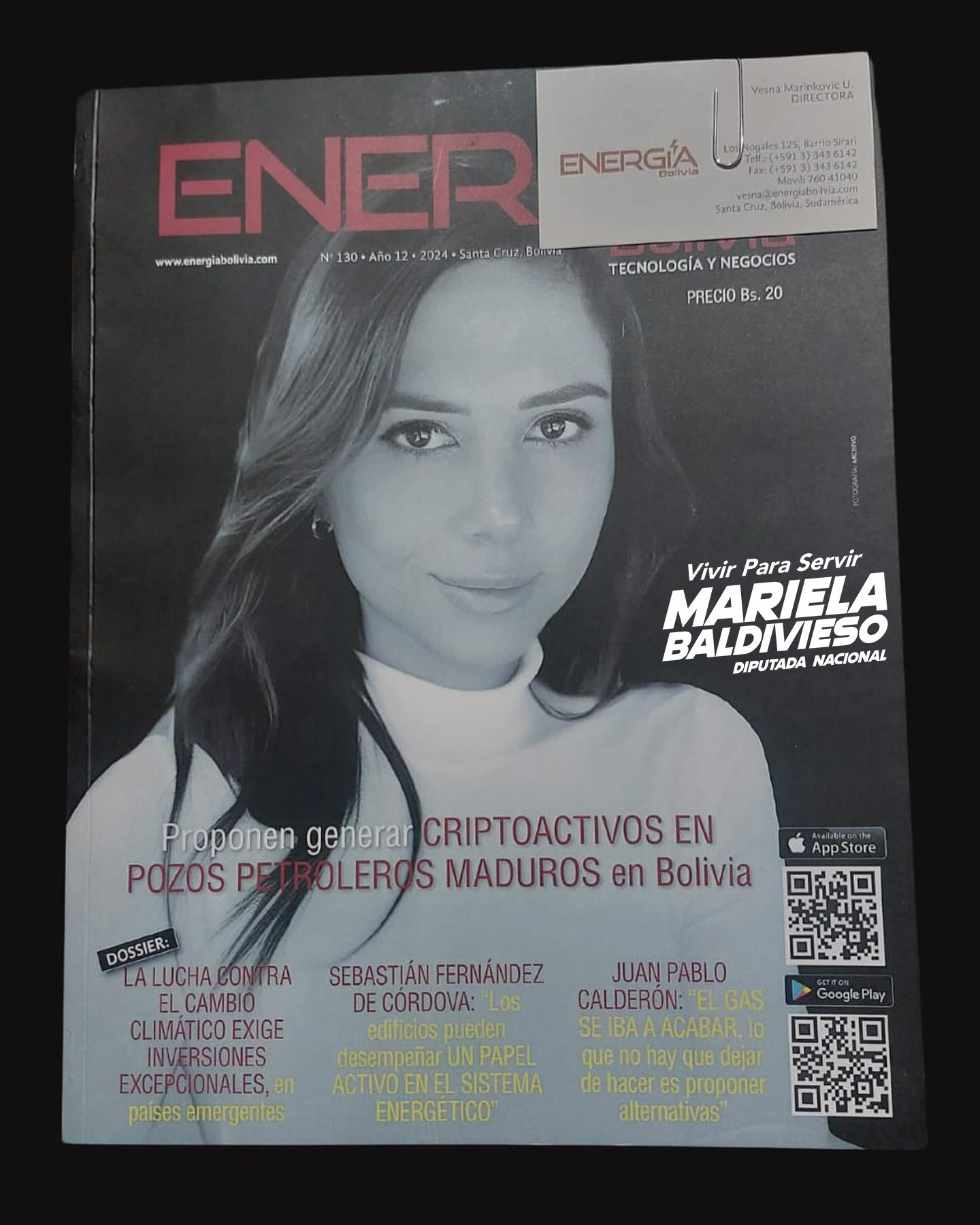 23 de mayo de 2024.- La diputada Mariela Baldivieso, protagonizo la portada de la revista Energía Bolivia de Santa Cruz en la edición 130; donde también compartió su opinión en la nota denominación: Proponen generar Criptoactivos en pozos Petroleros maduros en Bolivia.