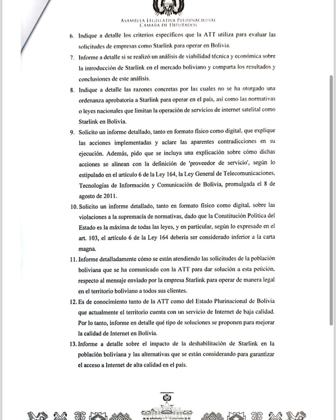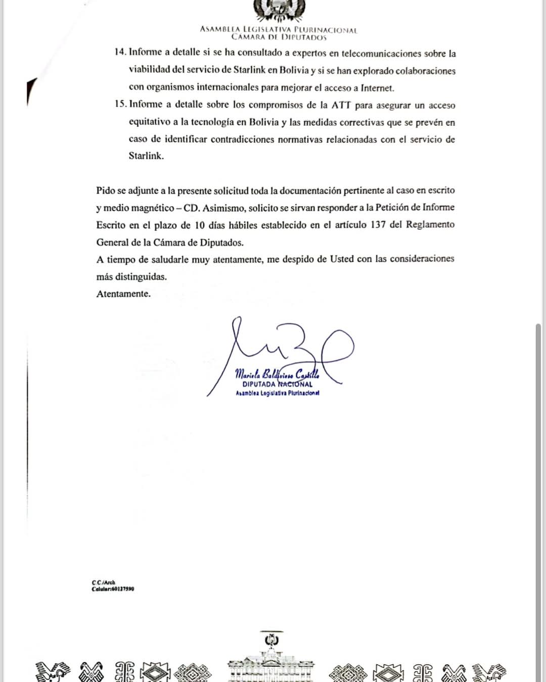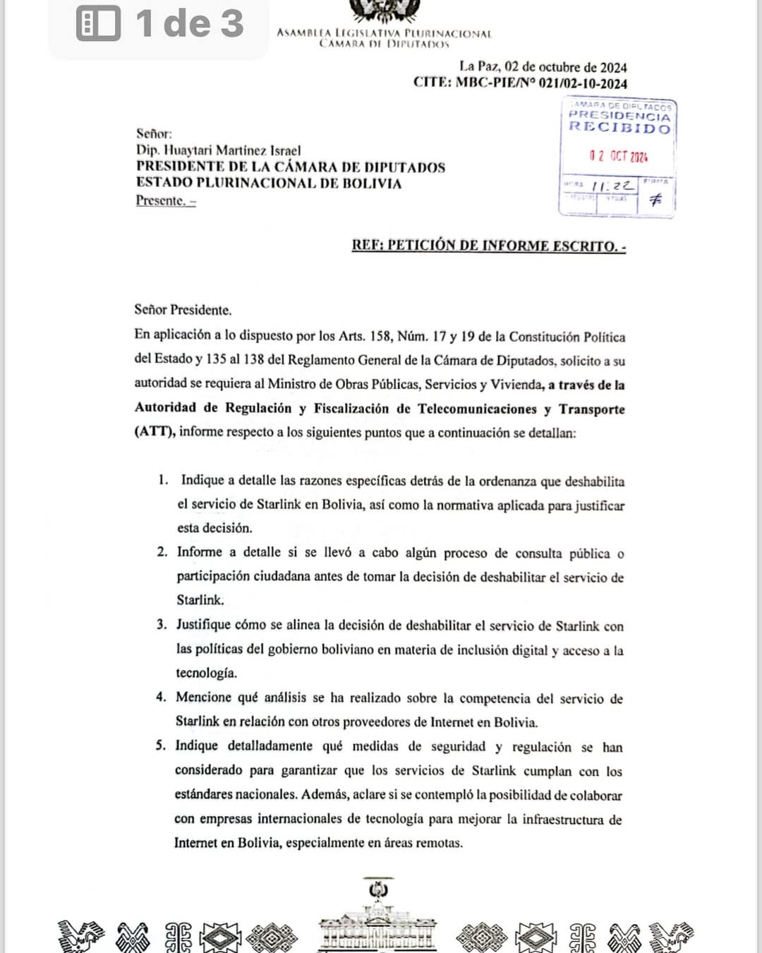 El 4 de octubre de 2024, la diputada nacional Mariela Baldivieso presentó una carta al presidente de la Cámara de Diputados, Huaytari Martínez, solicitando un informe detallado del ministro de Obras Públicas, Servicios y Vivienda sobre la reciente deshabilitación del servicio de Starlink en Bolivia.