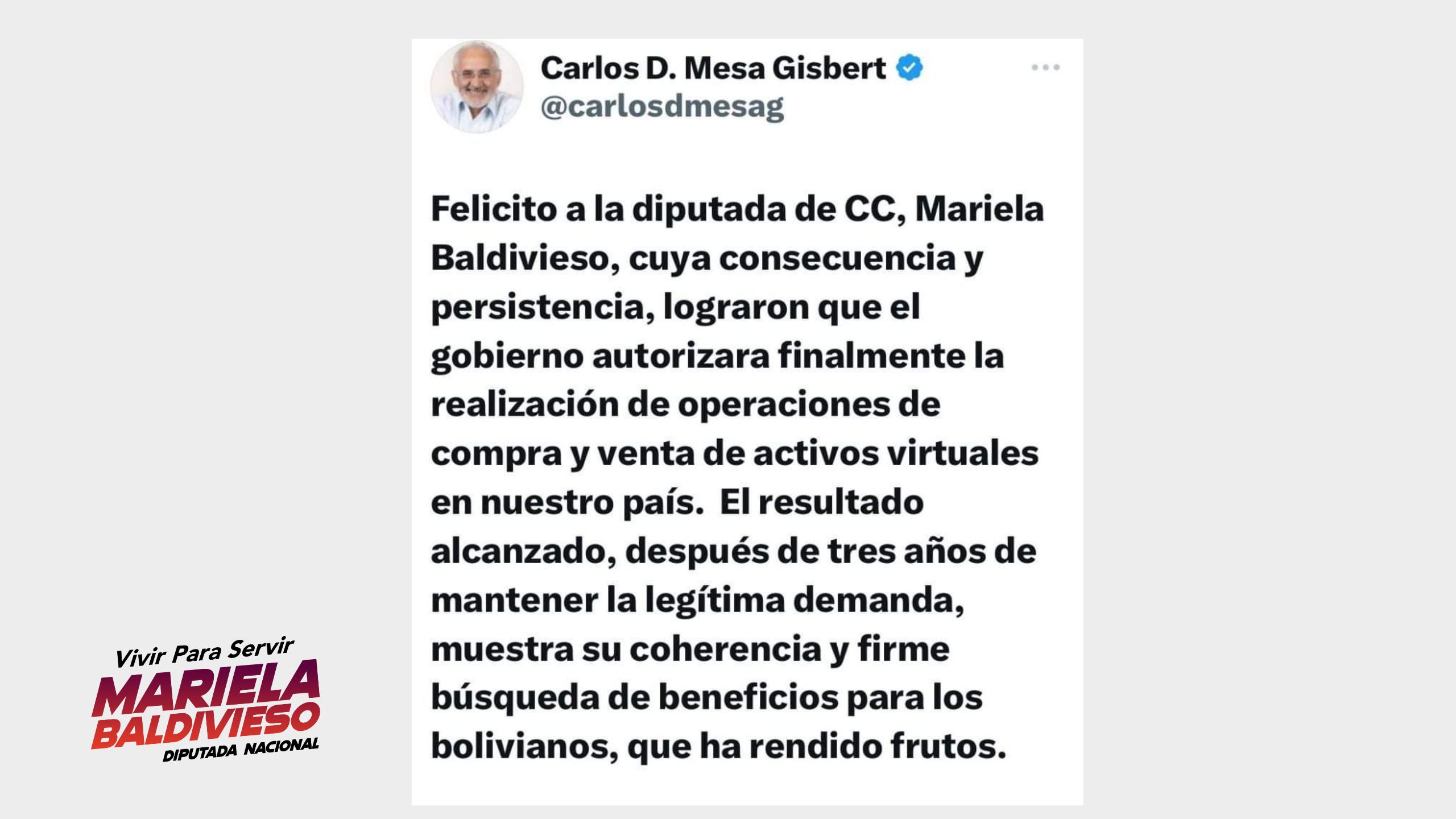 Carlos Mesa celebra el levantamiento de la restricción de criptoactivos en Bolivia gracias a la diputada Mariela Baldivieso