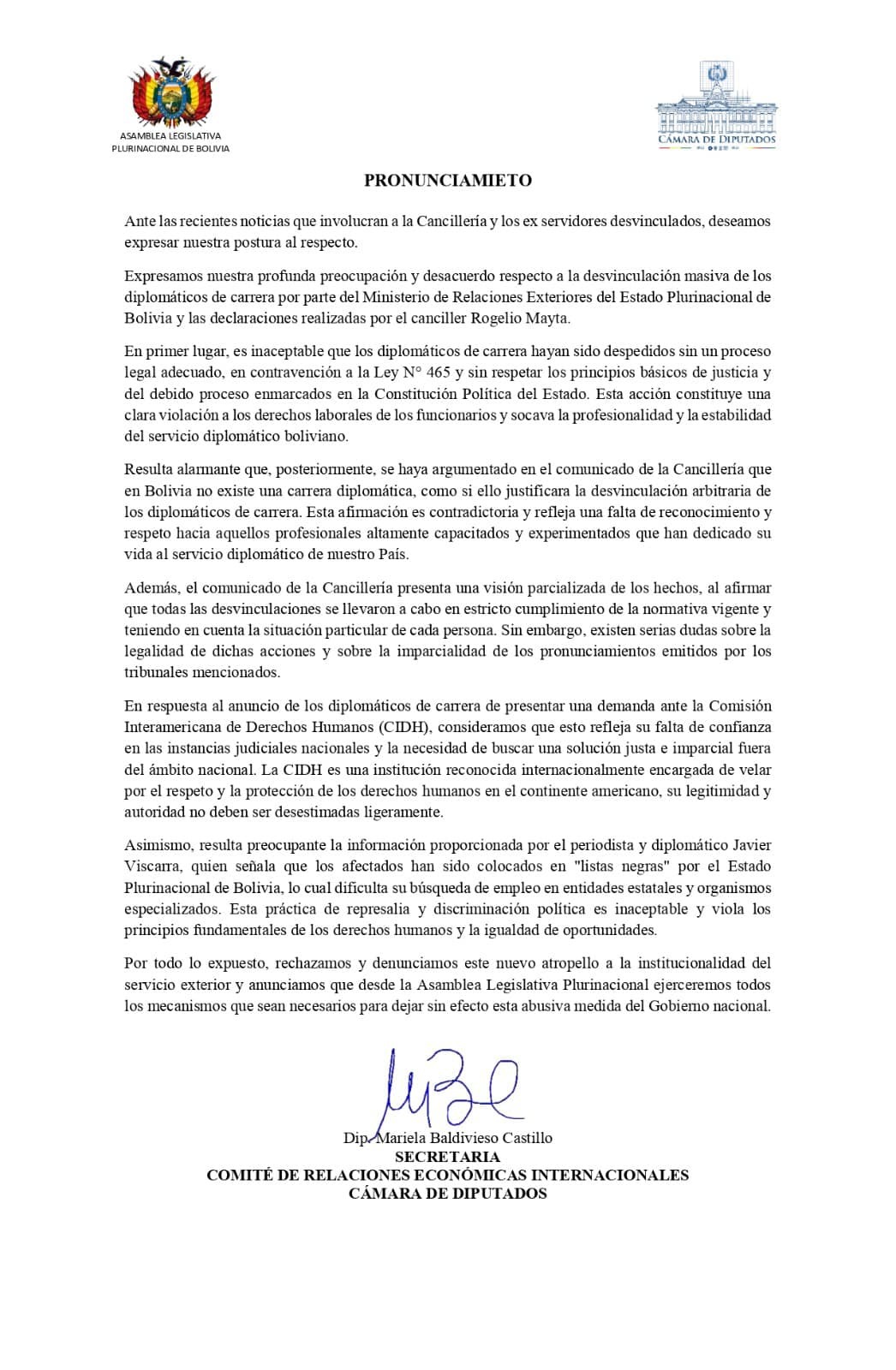 La Secretaria del Comité de Relaciones Económicas Internacionales, Mariela Baldivieso, emitió el 5 de julio de 2023 un pronunciamiento público expresando su desacuerdo y preocupación por la desvinculación masiva de diplomáticos de carrera por parte de...