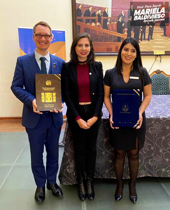 En conmemoración del 65 aniversario de la Cámara Junior Internacional Bolivia, la Diputada Mariela Baldivieso entregó un Homenaje Camaral y Reconocimiento a Viktor Omarsson, Presidente Mundial de la JCI, y a Karina Puente, Presidenta Nacional de la JCI Bolivia. El evento se llev...