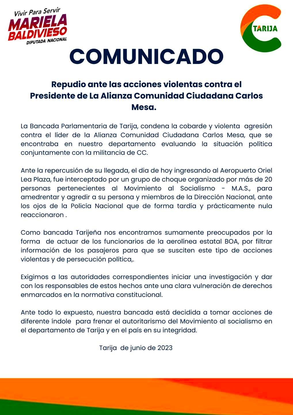 La Diputada Mariela Baldivieso, junto a la alianza Comunidad Ciudadana, emitió un comunicado en el cual expresaron su repudio e indignación frente a un grupo de choque masista. En dicho comunicado, se reveló que el presidente de la Alianza CC, Carlos Mesa, sufrió agresion...