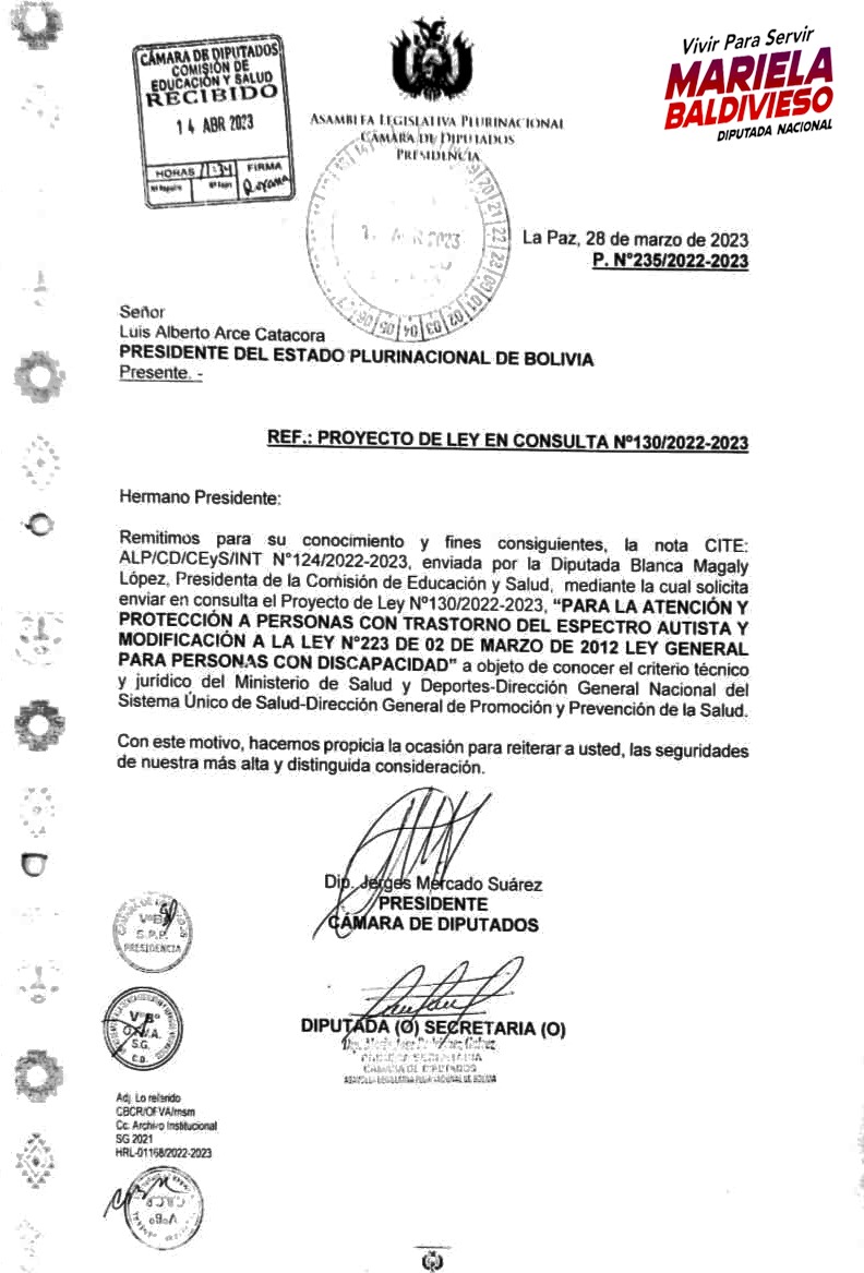 El 8 de mayo de 2023, la Cámara de Diputados envió para su revisión, el Proyecto de Ley Nº130 que se refiere a la “Atención y Protección de personas con el Espectro Autista” de la Diputada Mariela Baldivieso al Ministerio de Salud.