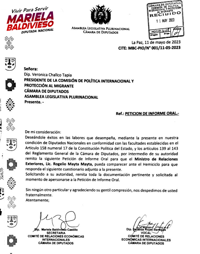 Desde el Comité de Relaciones Económicas Internacionales, la Diputada Mariela Baldivieso junto a la Diputada Senaida Rojas, el 11 de mayo del presente año, emitieron una Petición de Informe Oral para el Ministro de Relaciones Exteriores, Lic. Rogelio Mayta Mayta...