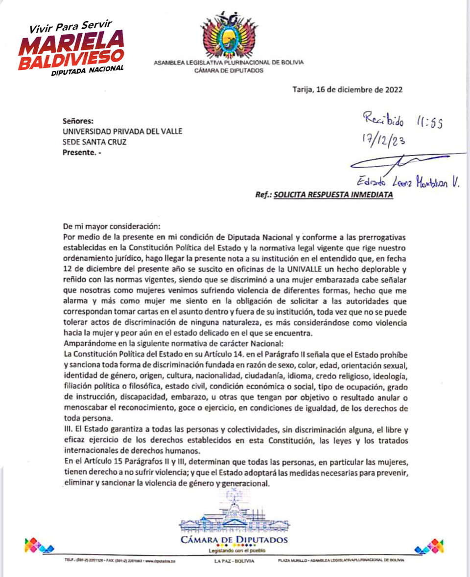 La parlamentaria Mariela Baldivieso denunció discriminación por parte de una Universidad Privada Del Valle del departamento Santa Cruz a una Profesional Tarijeña por estar embarazada, dicha información la dio a conocer el 19 de diciembre de 2022 a través...