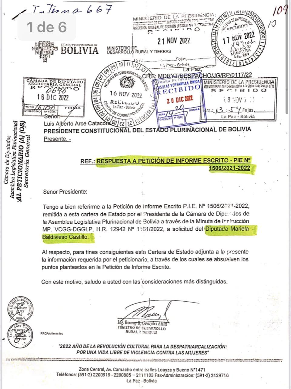La Diputada Mariela Baldivieso emitió una Petición de Informe Escrito (PIE) al Ministro de Desarrollo Rural y Tierras, Remmy Gonzales sobre el Instituto de Innovación Agropecuaria y Forestal (INIAF) y su relación con el sector Vitivinícola, el pasado 18 d...