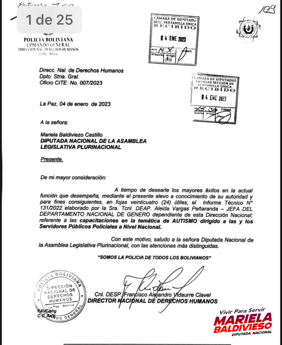 La legisladora Mariela Baldivieso informó que el Ministerio de Gobierno capacitó a más de 500 policías a nivel nacional sobre la condición del Trastorno del Espectro Autista, el 28 de enero de 2023 a través de sus redes sociales oficiales, informe...
