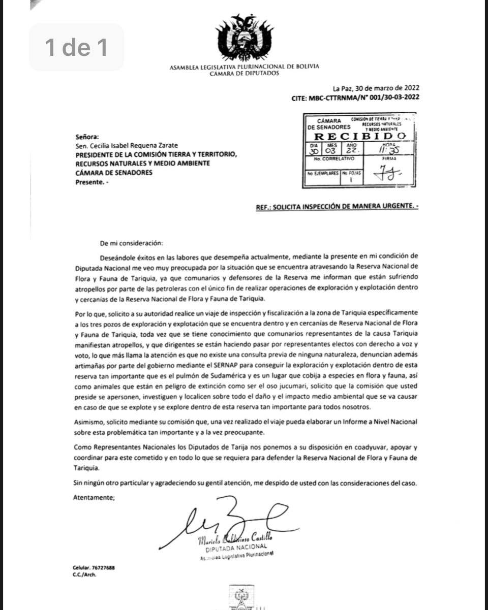 Mariela Baldivieso Castillo informó del trabajo a favor de Tariquia, el 5 de abril de 2022 a través de su página oficial de Facebook en la cual posteo con el siguente texto: “seguimos trabajando a favor de la causa #Tariquia” las distintas notas dirigidas...