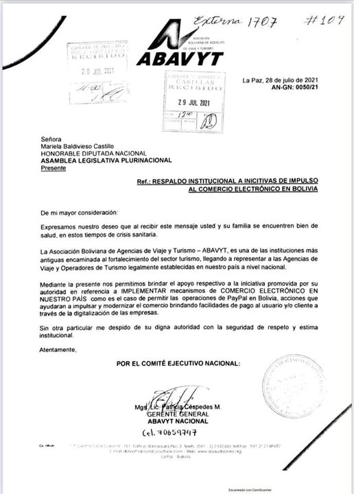 El pasado 2 de agosto de 2021, Mariela Baldivieso dio a conocer que la Asociación Boliviana de agencias de viaje y turismo brinda su respaldo institucional para la gestión de impulso al comercio electrónico mediante pasarelas de pago internacionales como PayPal. Dicha...