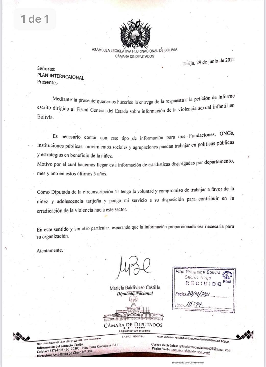 Mariela Baldivieso entregó las repuestas de Petición de Informe Escrito (PIE) del Fiscal General del Estado a las organizaciones de la sociedad civil que trabajan en disminuir la violencia sexual infantil en Bolivia. El pasado 10 de agosto de 2021, mediantes notas formales ad...