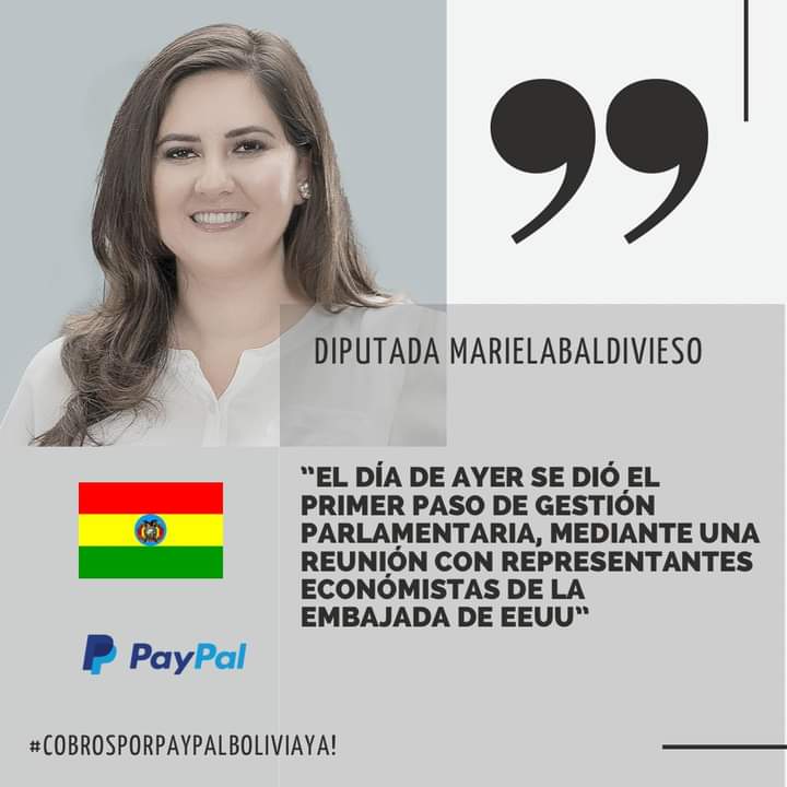 Diputada Mariela Baldivieso proporcionó la respuesta a la solicitud enviada para la activación de PayPal en Bolivia, en fecha 19 de abril del 2021 a la embajada de EE.UU., a los ciudadanos bolivianos el 19 de mayo del 2021 hizo pública dicha respuesta en sus di...