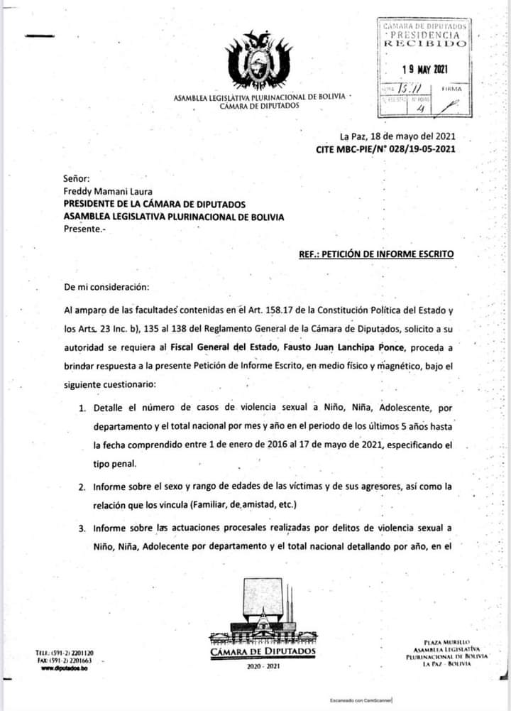 Diputada Baldivieso requirió Petición de Informe Escrito (PIE) dirigido al Fiscal General del Estado sobre Violencia Sexual Infantil en Bolivia, dicha petición fue ingresada en fecha 19 de mayo del 2021 en la ciudad de La Paz.