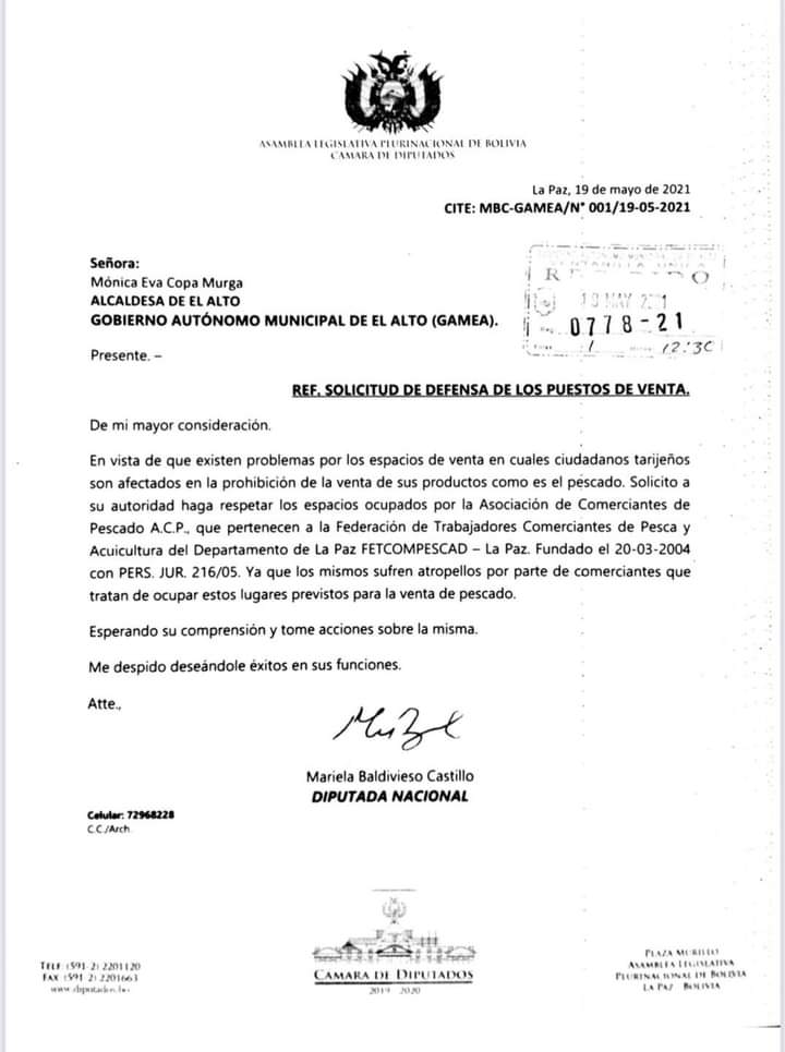 Diputada tarijeña Mariela Baldivieso solicitó a la alcaldesa de El Alto, Mónica Eva Copa Murga, haga respetar los espacios ocupados por la Asociación de Comerciantes de Pescado (A.C.P) que pertenecen a la Federación de Trabajadores Comerciantes de Pesca ...
