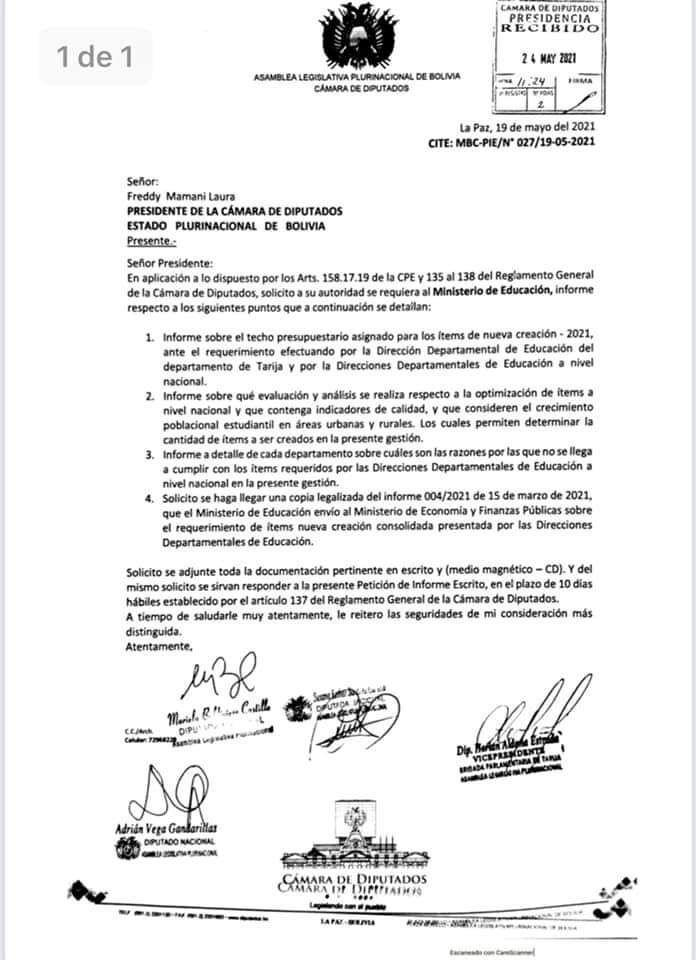 Diputados de Tarija de la bancada de Comunidad Ciudadana exigen respuesta al Ministerio de Educación mediante una Petición de Informe Escrito acerca la problemática de ítems de educación que enfrentan padres de familia de 43 colegios de Tarija. ...