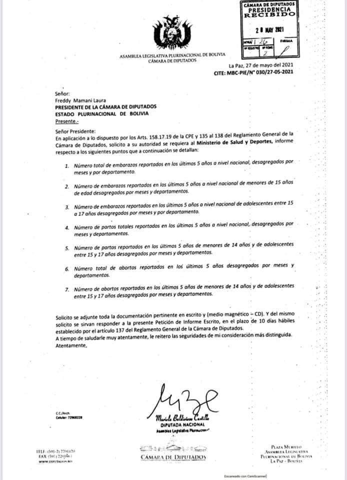 La legisladora Mariela Baldivieso pidió información al Ministerio de Salud sobre el embarazo adolecente en Bolivia, el pasado 28 de mayo del 2021, mediante el instrumento de fiscalización que ejecuta como autoridad nacional, ya que el problema es muy latente en el pa&...