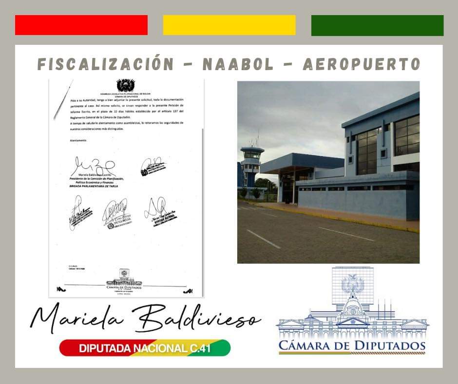 La diputada Nacional Mariela Baldivieso Castillo  informó haber presentado una petición de Informe Escrito y nota de recomendación  a Navegación Aérea y Aeropuertos Bolivianos NAABOL, el 8 de julio de 2022 en la ciudad de La Paz, junto a senador...